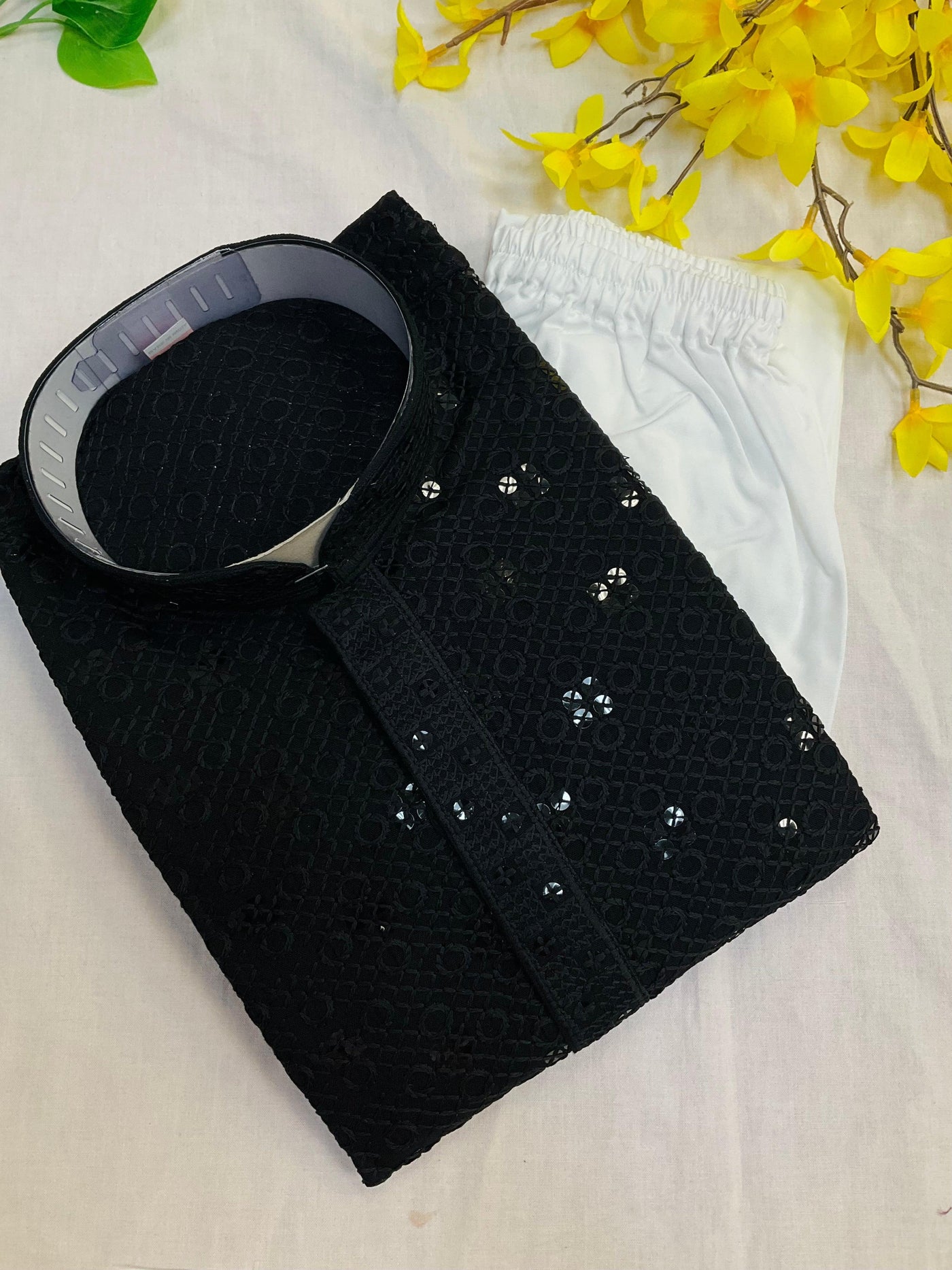 Dress your little one in timeless elegance with this sophisticated boys black sequence kurta set featuring intricate embroidery and luxurious detailing. This premium Indian ethnic wear ensemble pairs a richly embellished black rayon kurta with crisp white elastic waist pants for effortless comfort and refined style.