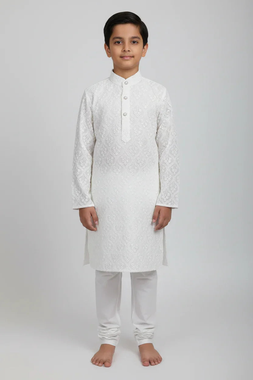 Boys White Chikankari Kurta Pajama Set - Traditional Kids Wear
