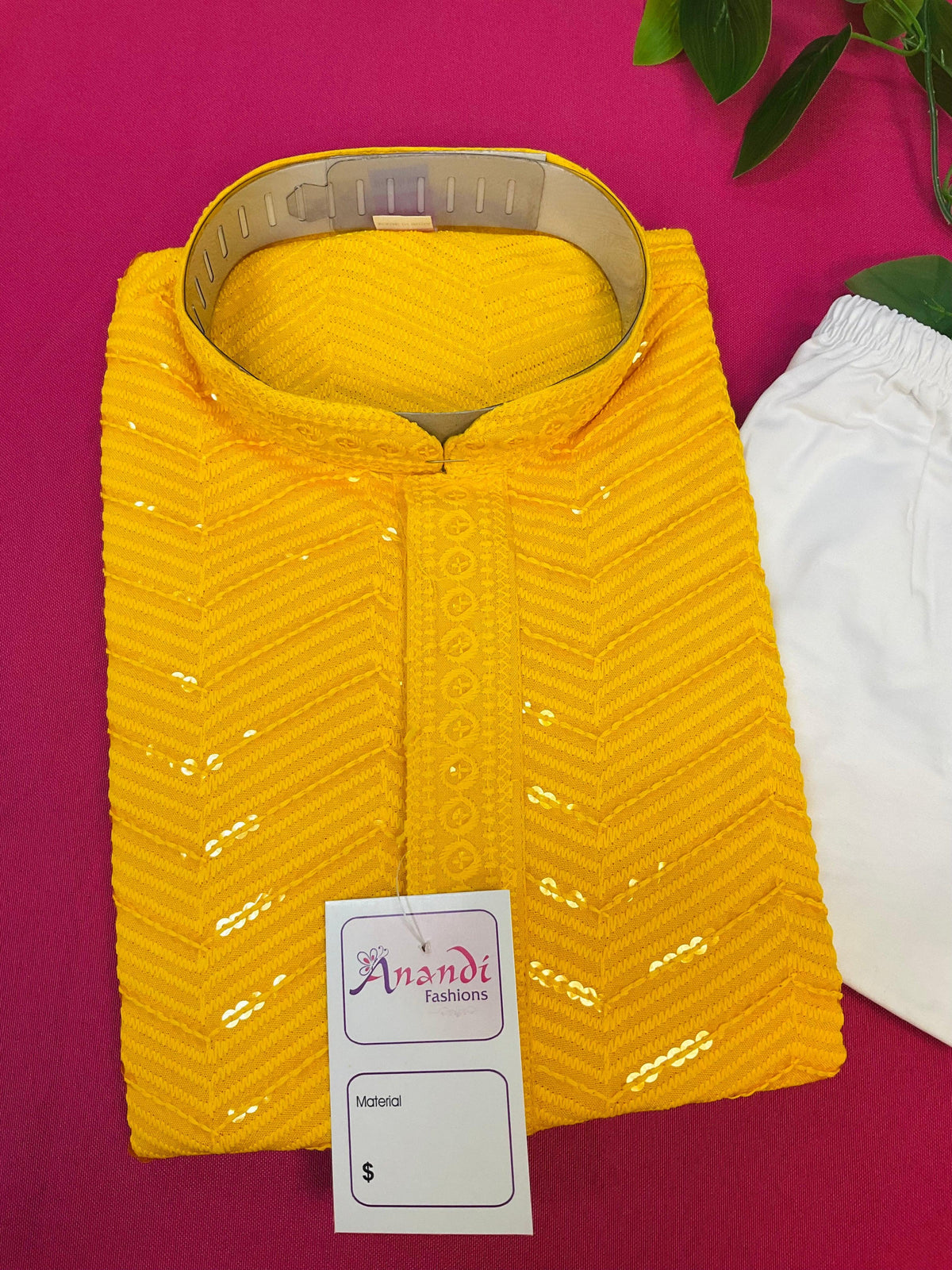 Brighten up your little one's ethnic wardrobe with this vibrant boys yellow sequence kurta set featuring intricate embroidery and elegant detailing. This premium Indian ethnic wear ensemble pairs a richly embellished yellow rayon kurta with crisp white elastic waist pants for effortless comfort and festive style.