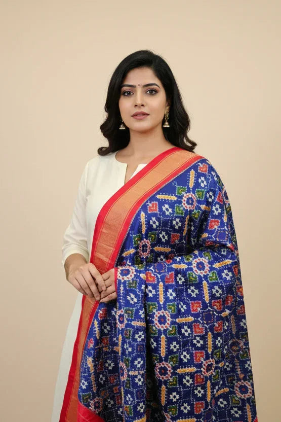 Enhance your ethnic wardrobe with the Royal Blue Pure Ikkat Silk Dupatta from Anandi Fashions, an epitome of timeless elegance and intricate craftsmanship. This luxurious dupatta, showcasing the authentic and traditional Ikkat weaving technique, is meticulously handcrafted by skilled artisans to ensure every piece stands as a testament to the rich cultural heritage of India. The Royal Blue hue exudes a regal charm, making it a standout accessory that complements a wide range of outfits, from exquisite sarees and contemporary kurtis to traditional ghagra cholis and opulent lehengas. At Anandi Fashions, we pride ourselves on offering premium Indian ethnic wear that not only honors and preserves tradition but also elevates and celebrates modern style. Complete your ensemble with this exquisite piece, designed to add a touch of sophistication and grace to your look. While you are here, take the opportunity to explore our extensive and carefully curated collection of sarees, elegant blouses, and stunning artificial jewelry that together can help you make a memorable statement at any event. Shop now and experience the perfect blend of heritage and contemporary fashion that Anandi Fashions is renowned for, ensuring you stand out with grace and elegance wherever you go.