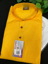Introducing our Mens Kurta Pajama Set in a vibrant shade of yellow. This festive kurta is paired with a white pajama for an elegant ethnic set that will elevate your traditional attire. Our stylish kurta pair is a comfortable ensemble that will make you look and feel your best. The sleek kurta design is perfect for any special occasion and is a must-have in every man's fashion wardrobe. Get ready to stand out in our ethnic men's duo.