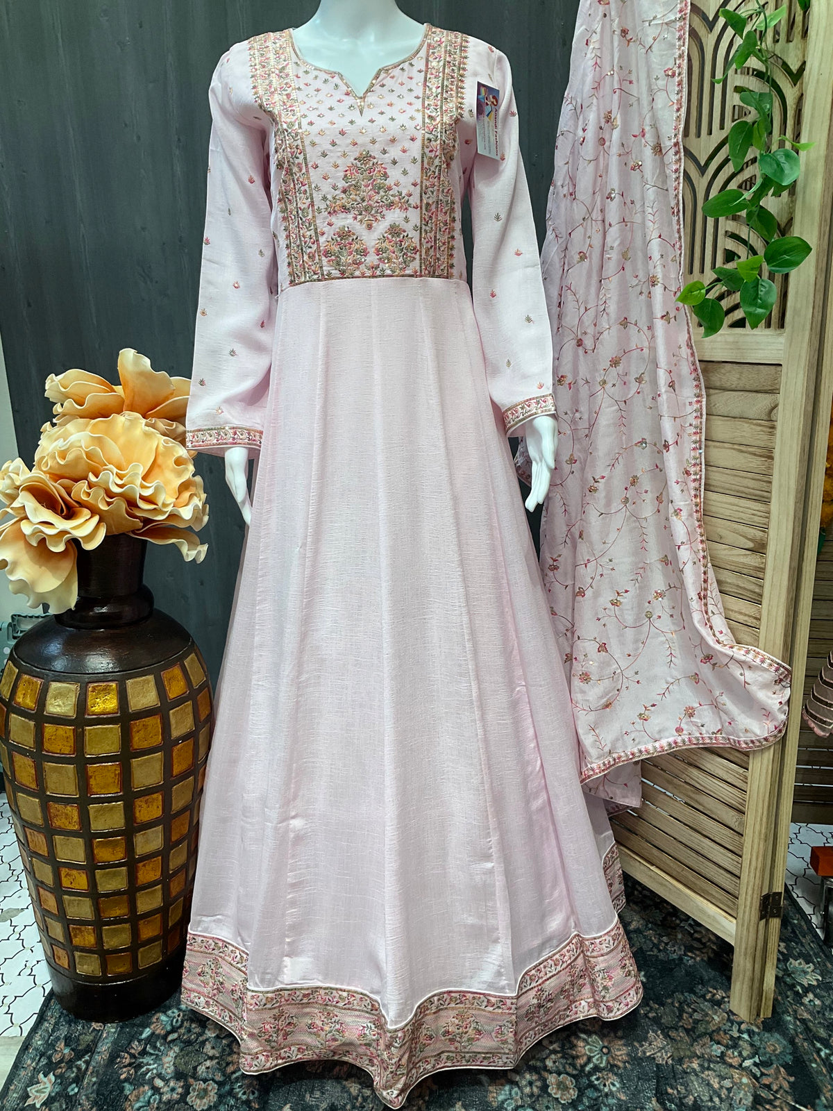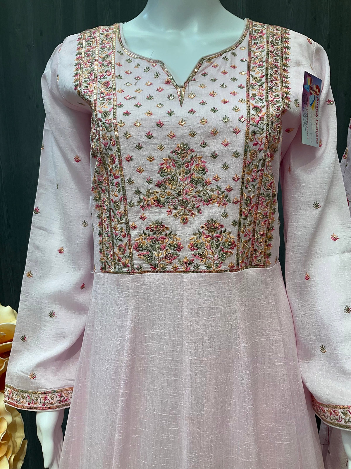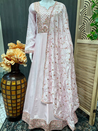 This stunning long sleeve dress in a beautiful baby pink color is made from premium quality silk material, ensuring a luxurious and elegant look. The heavy embroidery adds a touch of sophistication and glamour, making it perfect for special occasions or formal events.