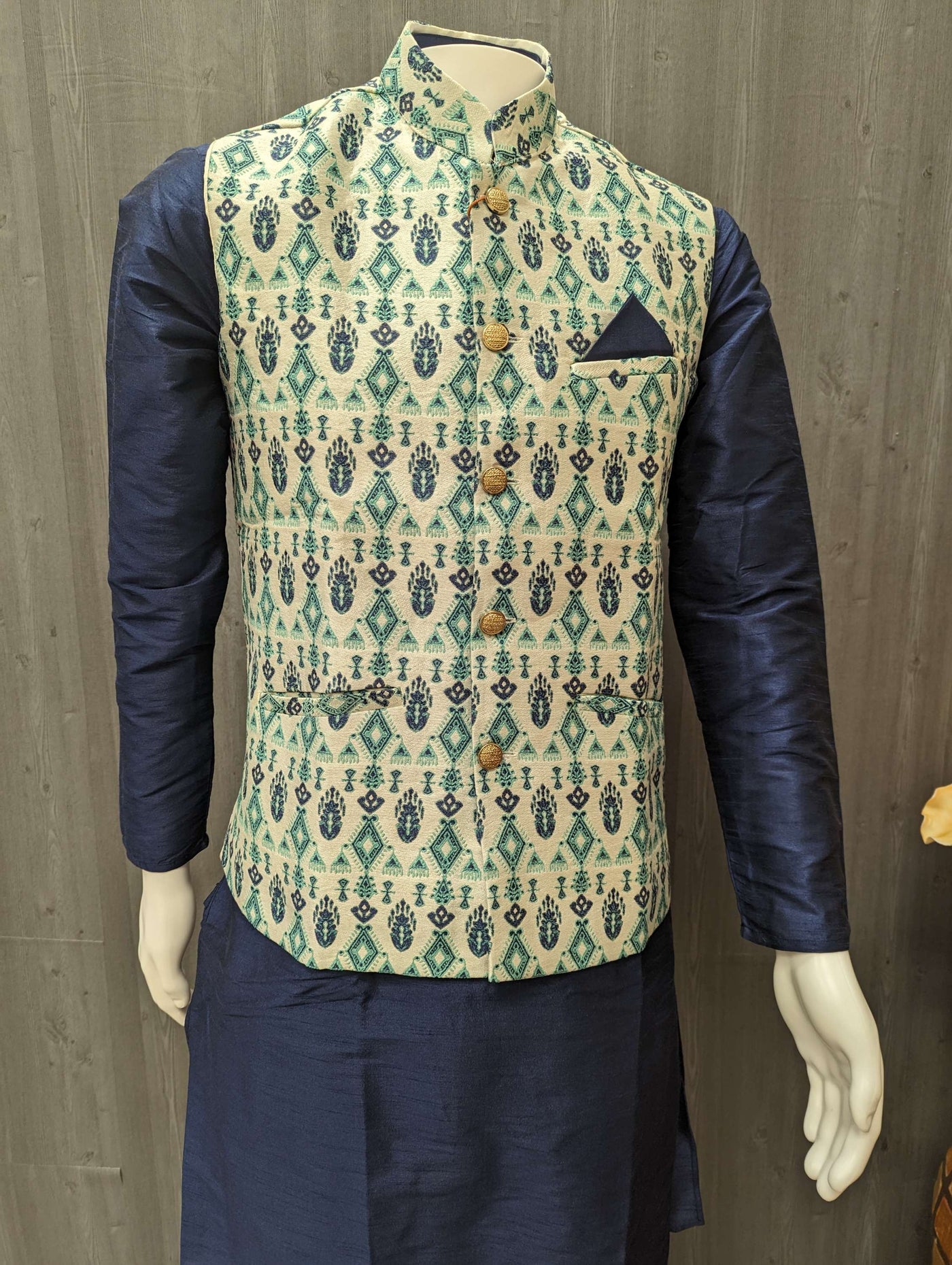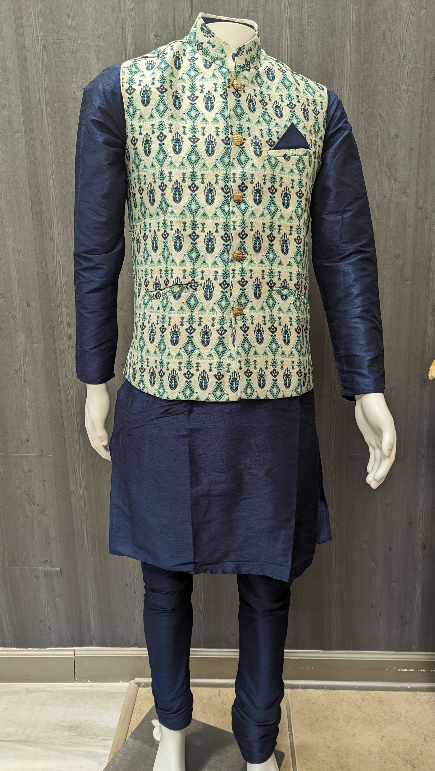 Introducing our stylish and comfortable Navy Blue Kurta Pajama set with vest, perfect for any formal or casual occasion. Made with high-quality cotton fabric, this set offers a relaxed and breathable fit. The kurta features elegant embroidery along the neckline and cuffs, while the pajama comes with a comfortable elastic waistband. The matching vest adds a touch of sophistication and completes the overall look. Available in various sizes, this Navy Blue Kurta Pajama set with vest is a must-have addition to your wardrobe.