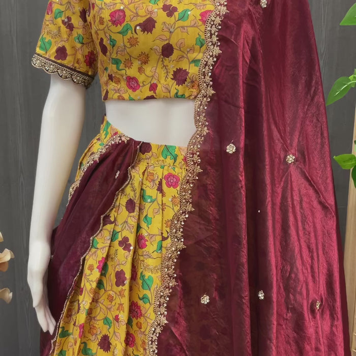 Inform when this item available Yellow -Kalamkari lehanga/Half Saree Collection blouse size 36(fits upto 42)