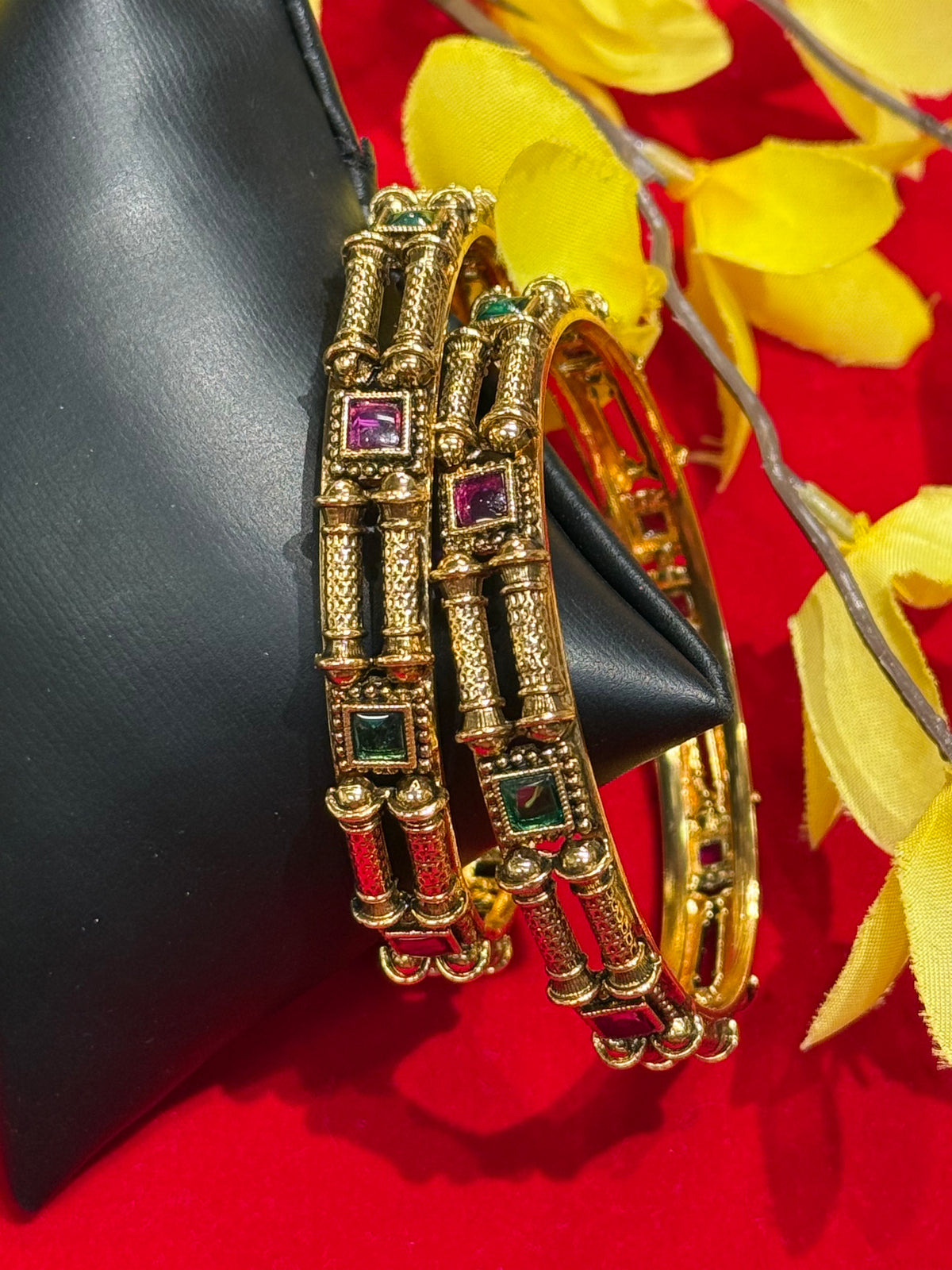 Beautiful designer antique bangles featuring elegant pink and green stones. Pair of 2 bangles with intricate traditional design. Perfect for weddings, festivals, and special occasions. Premium quality craftsmanship.