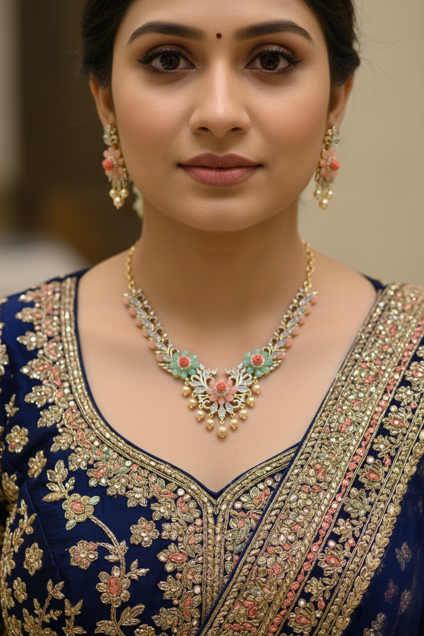 This necklace set stands out with its unique combination of sparkling CZ stones and colorful Monalisa beads. The floral design adds feminine elegance while the Monalisa beads introduce vibrant color accents that make this piece truly special. Perfect for those who appreciate distinctive jewelry that combines traditional craftsmanship with contemporary flair.
