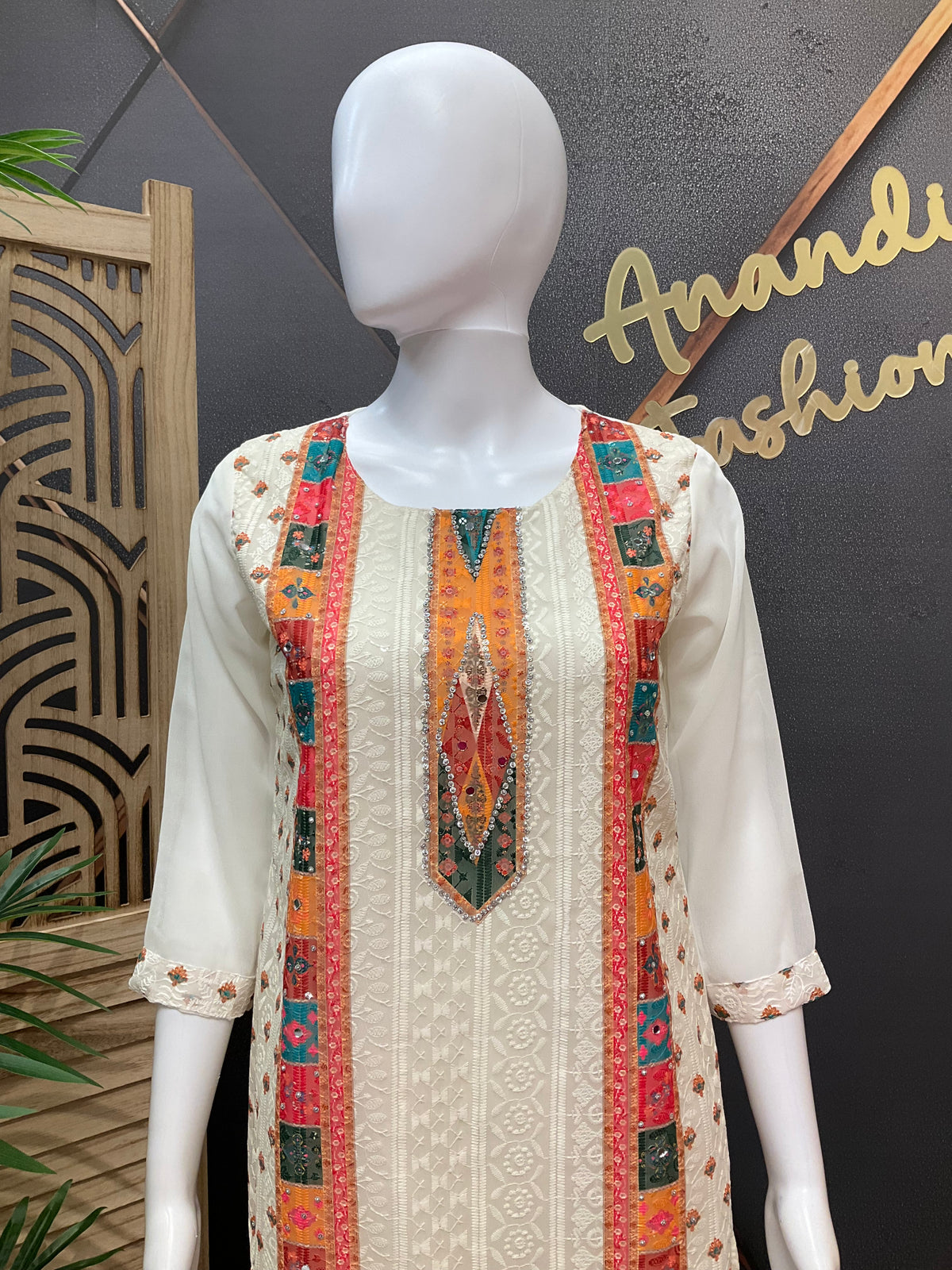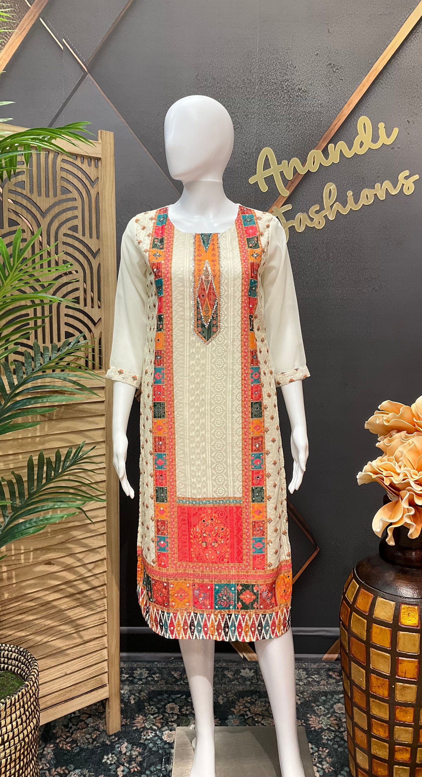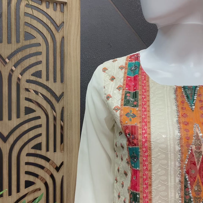 Half White Chikankari Work Georgette Kurti with colorful design.