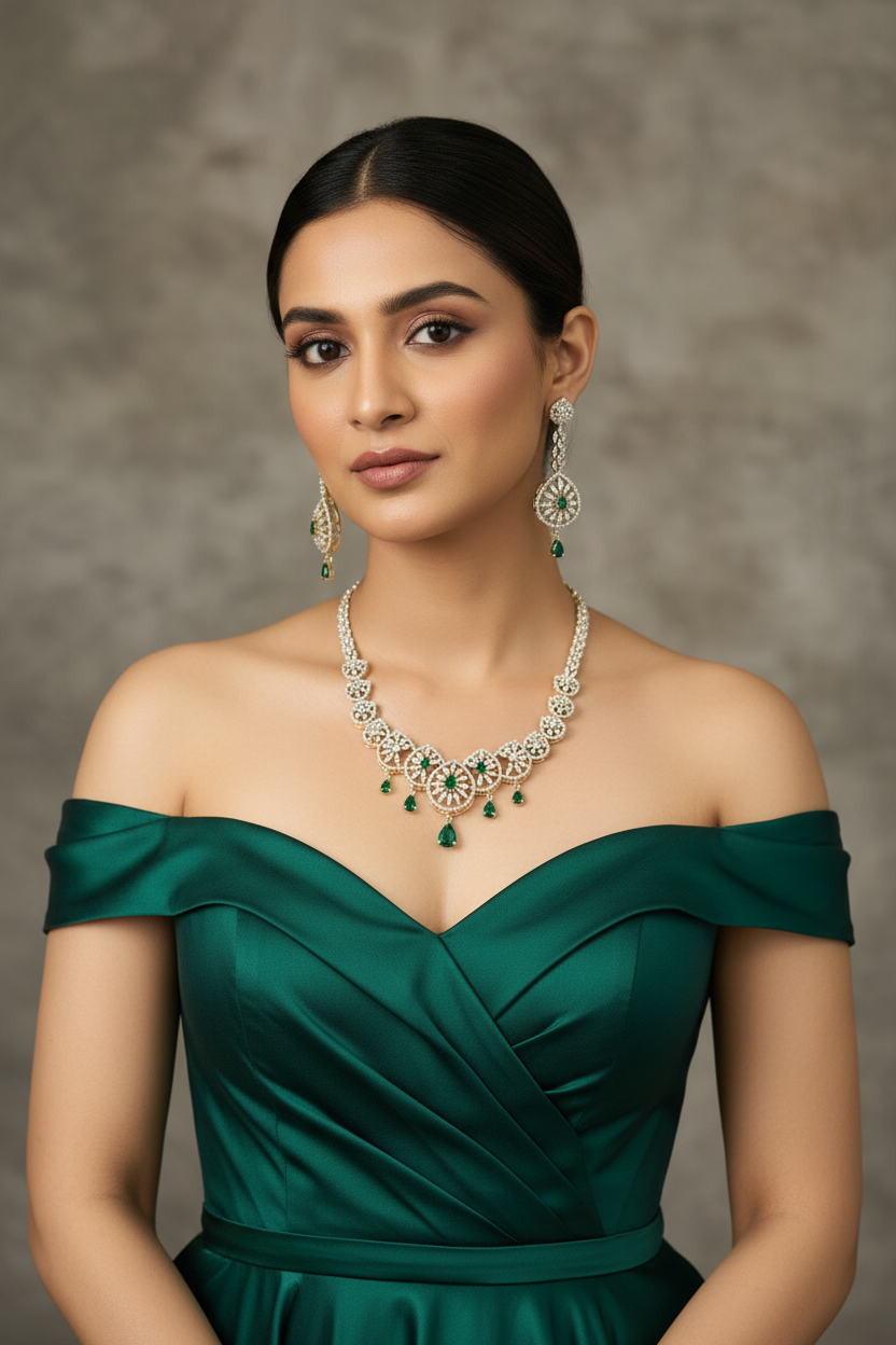 Add a touch of regal elegance to your celebration attire with this exquisite CZ necklace set featuring stunning emerald stones. The perfect blend of traditional craftsmanship and contemporary sparkle, this jewelry set is designed to make you shine at every special occasion.