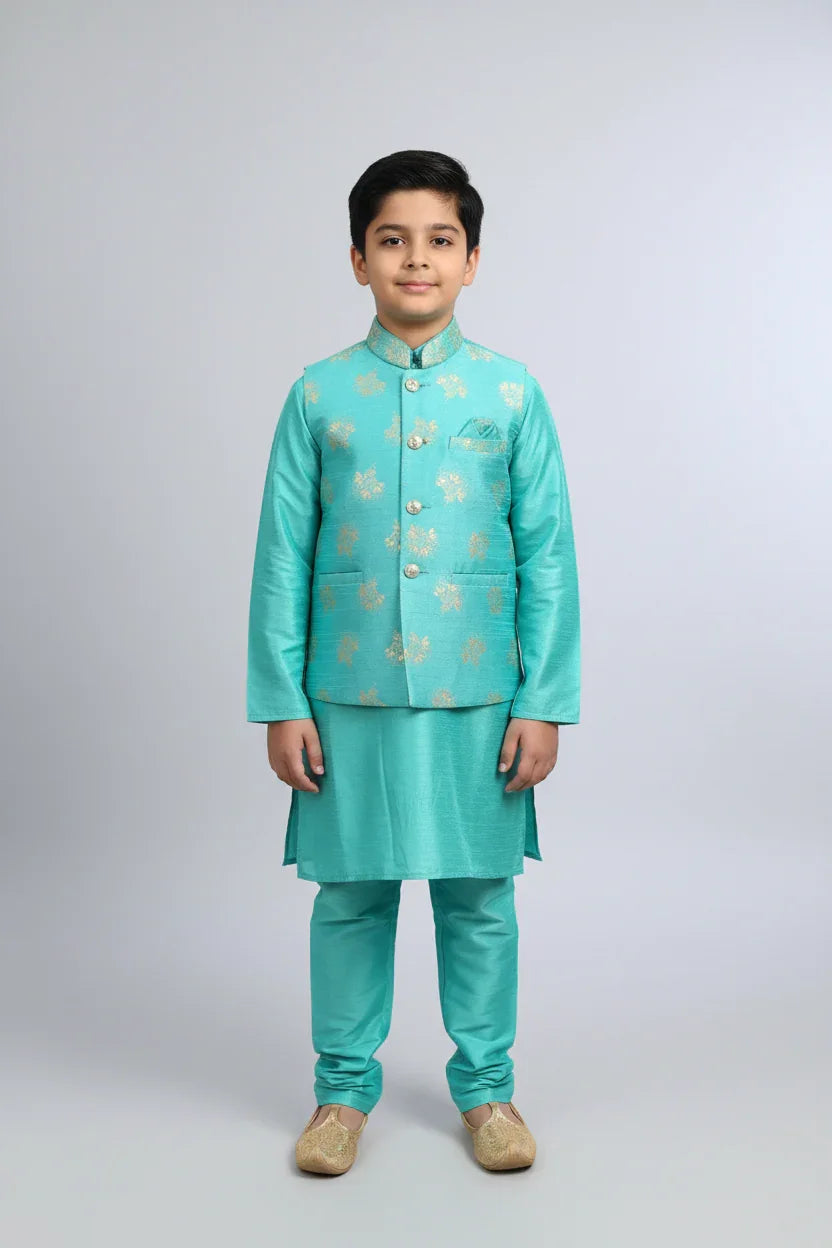 This boys' kurta pajama set features a thoughtfully designed coordinating vest or coat, adding a refined touch to traditional attire. Crafted to ensure comfort and style, it is ideal for festive occasions and cultural events. Please note that the actual color may vary slightly from the images due to lighting and photographic effects, ensuring each piece has its unique charm.