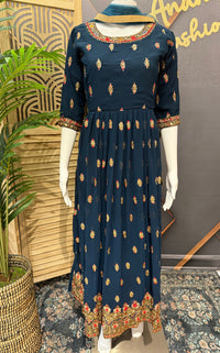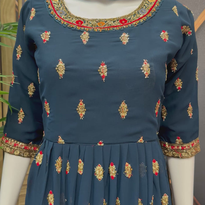 Teenage Girls -Long Party Wear Embroidery Work Georgette Long Dress in Navy Blue Color with Net Dupatta.