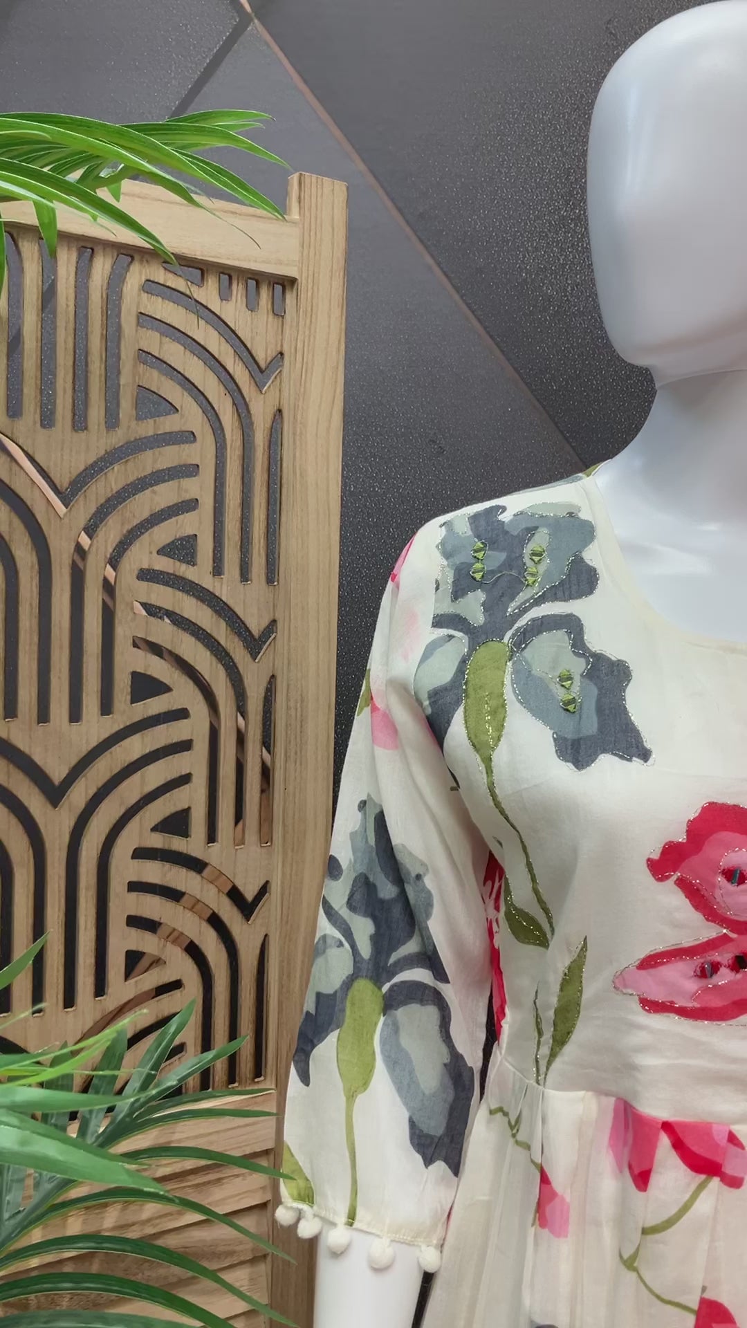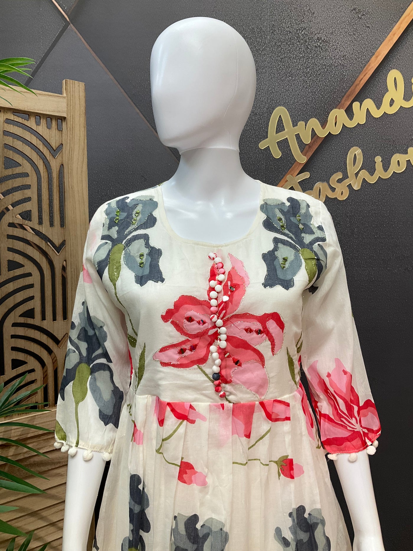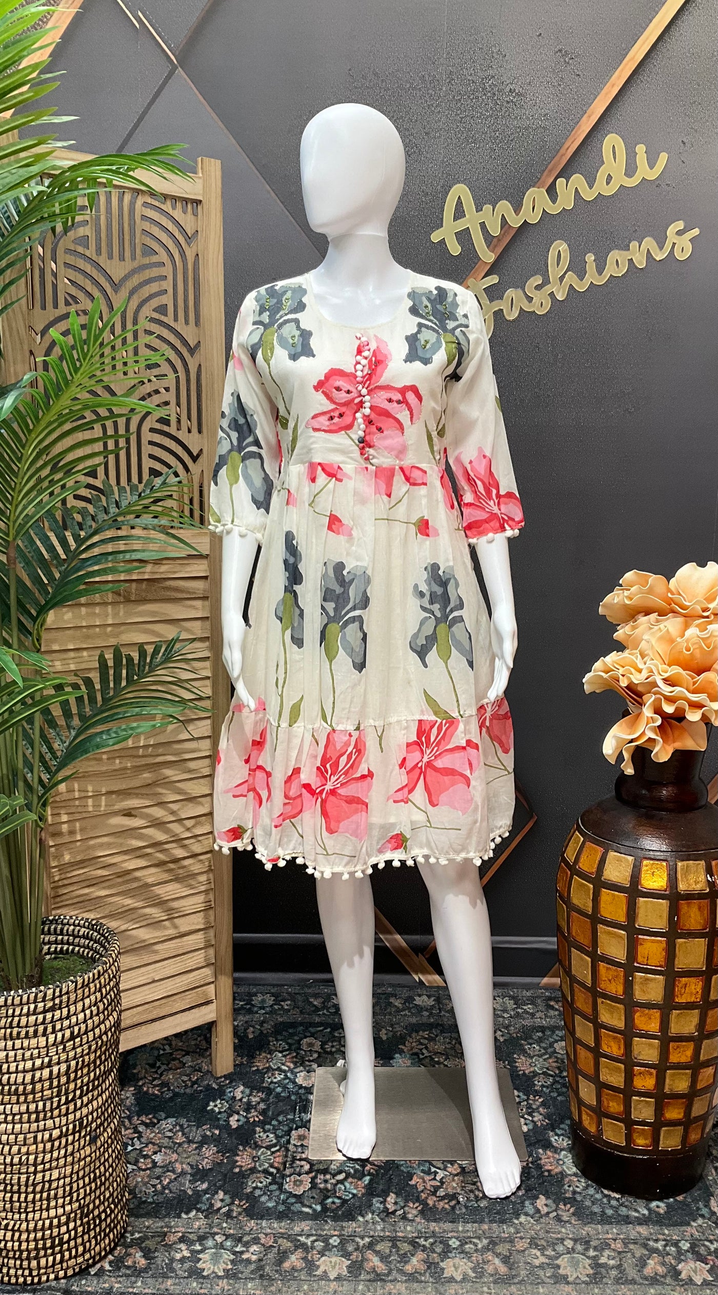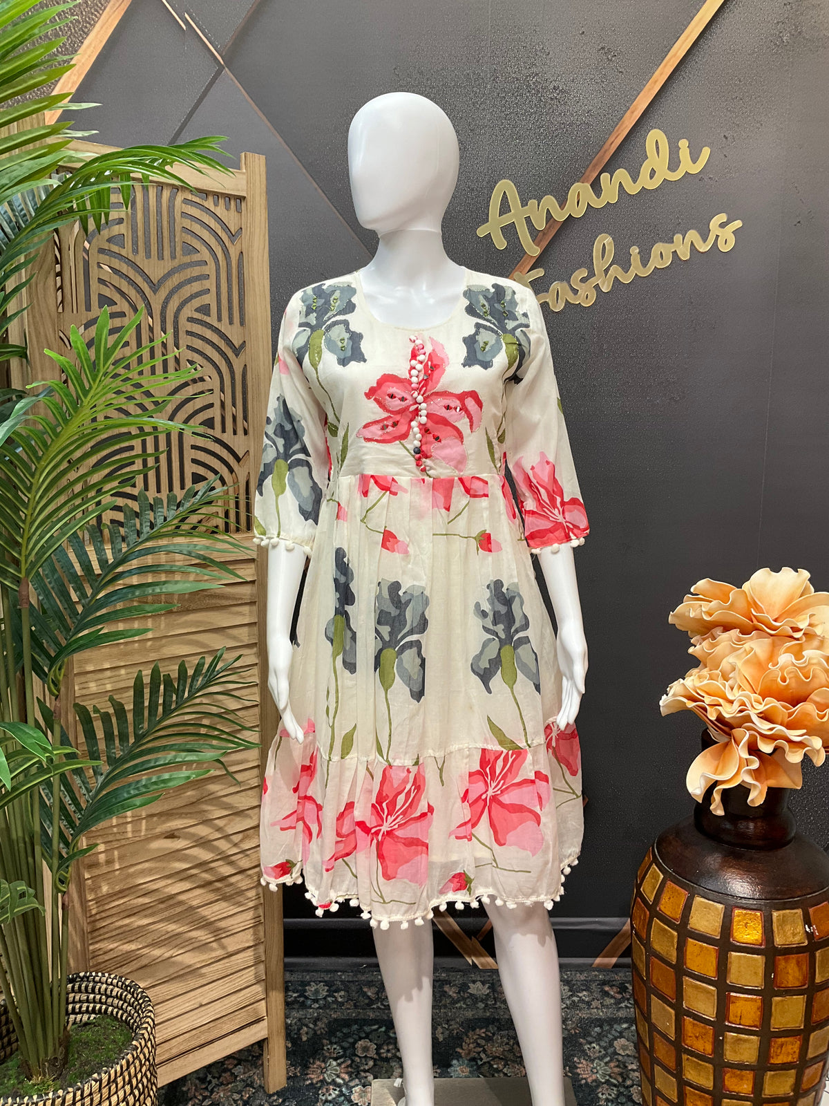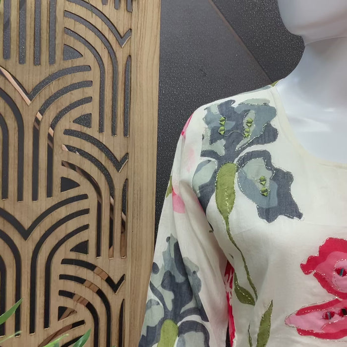 Half White color- Floral Mulmul Cotton Knee Length Gown/Kurti