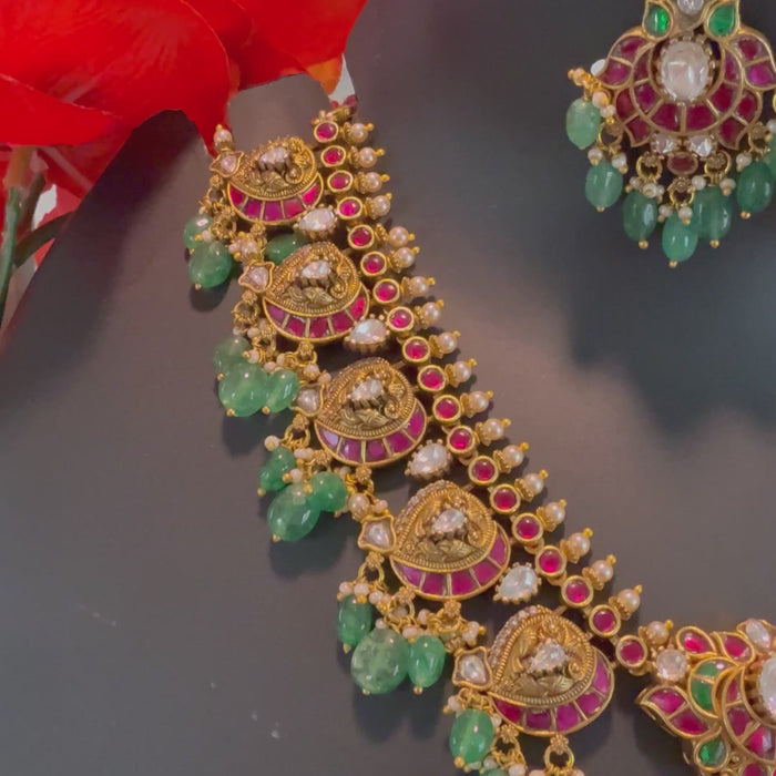 Heavy Jadau Kundan Necklace set with Pendant and Kundan’s and Monalisa beads hanging.