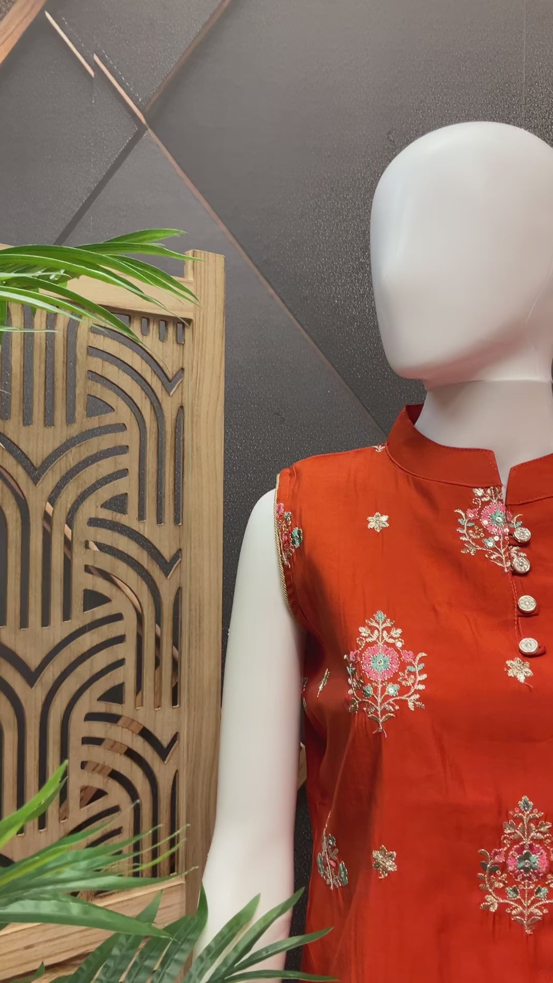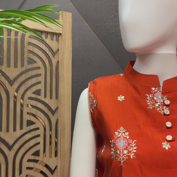 Orange Color- sleeveless Silk Kurta set with chiffon dupatta.
