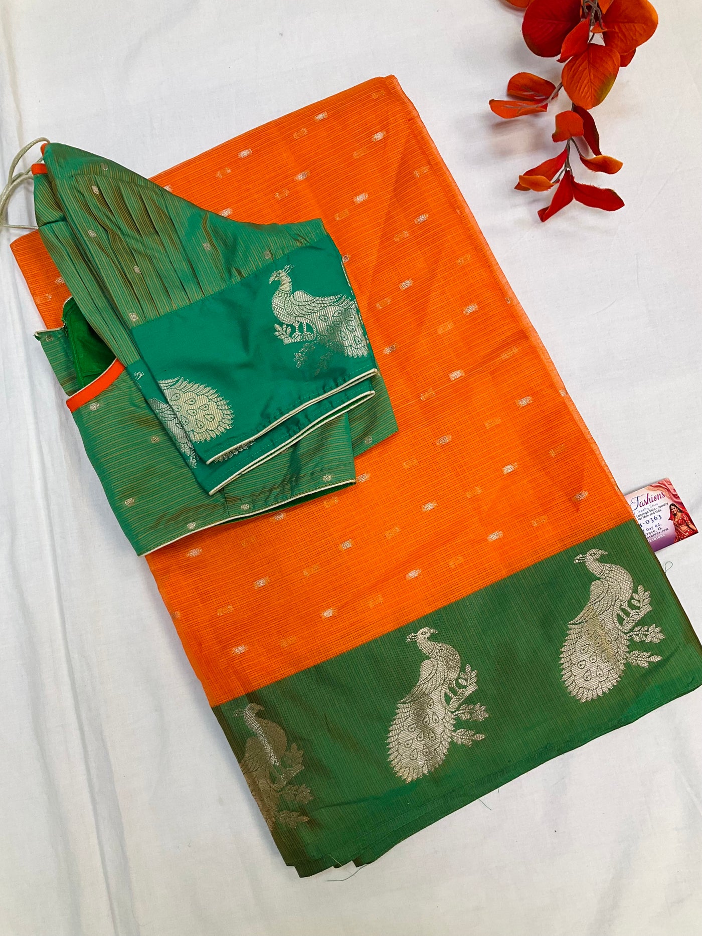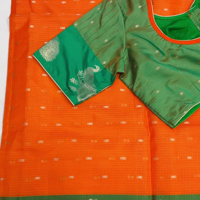 Orange Semi Silk saree with Green Border and Peacock design. Comes with Stitched blouse and Fall pico done.