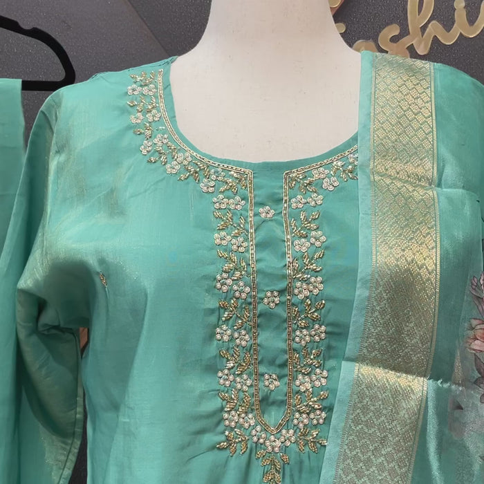 Plus Size - Aqua Green Shimmery Tissue Party Wear Set. This set comes with digital print floral dupatta.