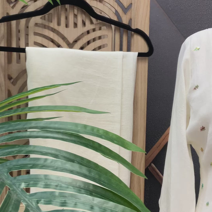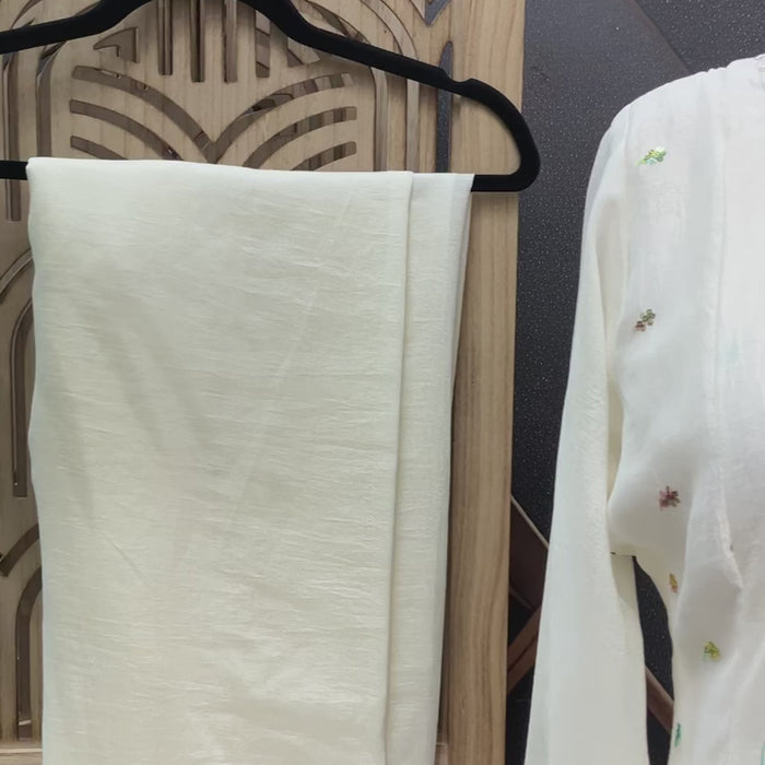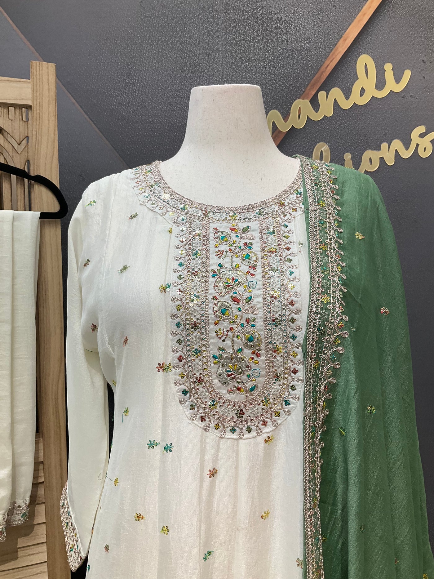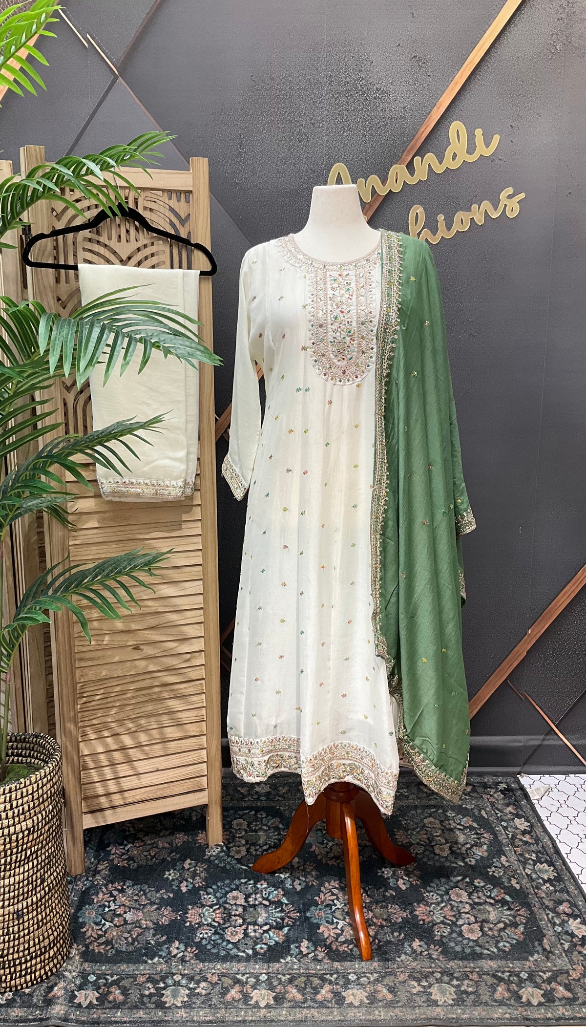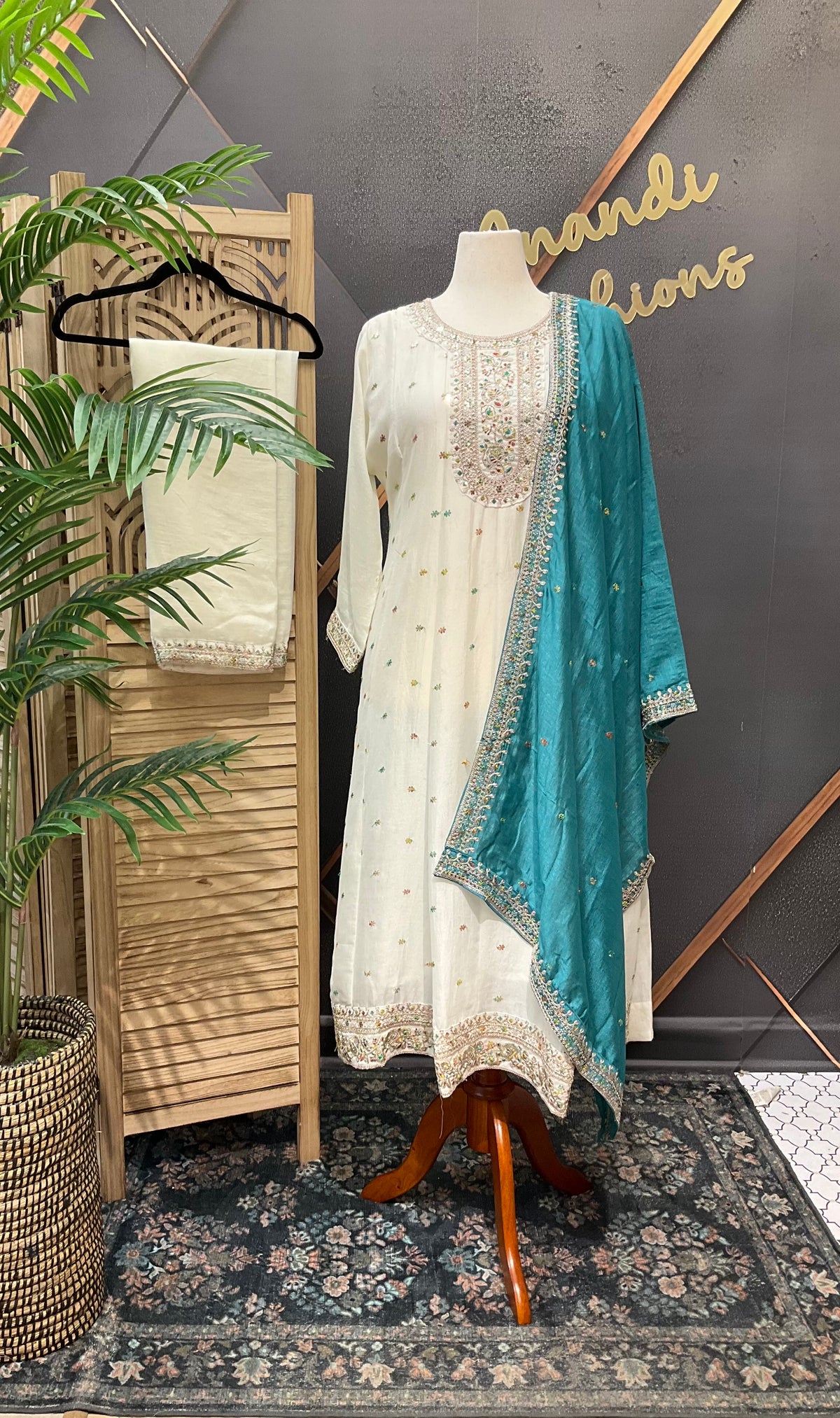 Plus size Half white Anarkali Kurti set with contrast color dupattas.