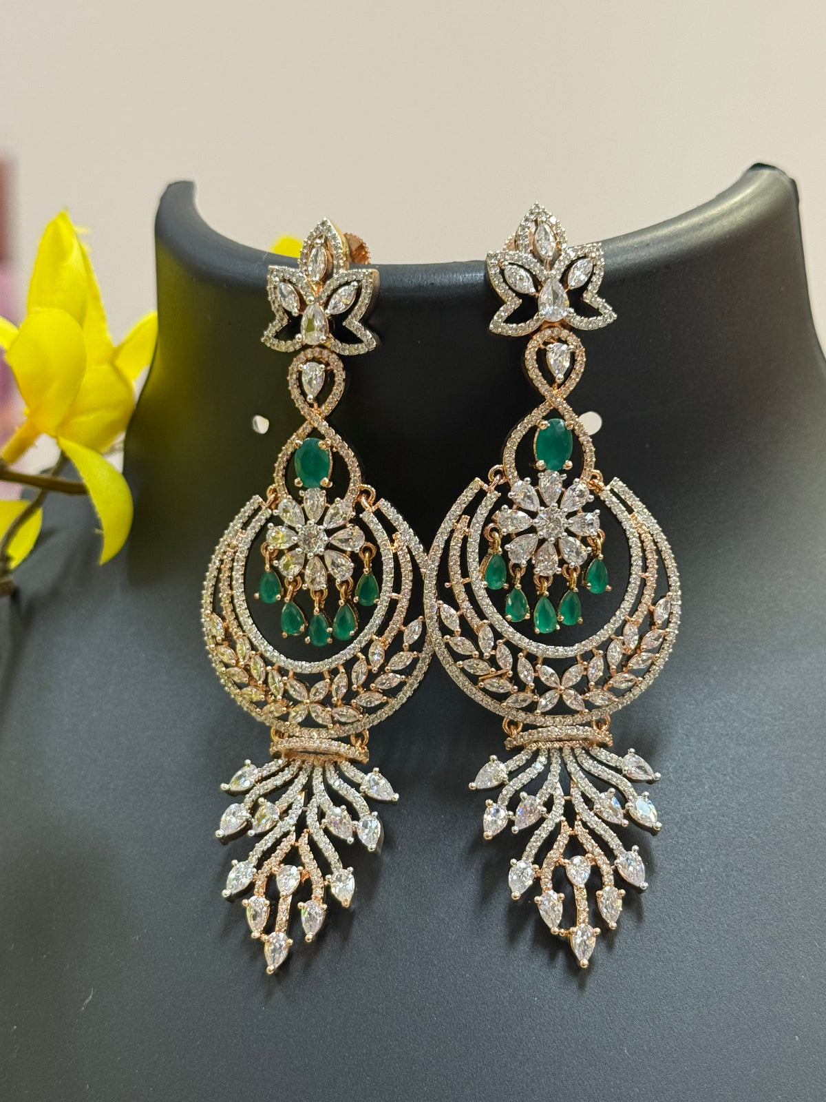 Rose Gold CZ Long Earrings with Emerald stones.
