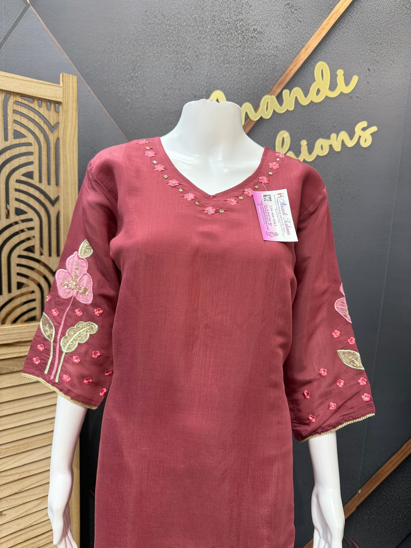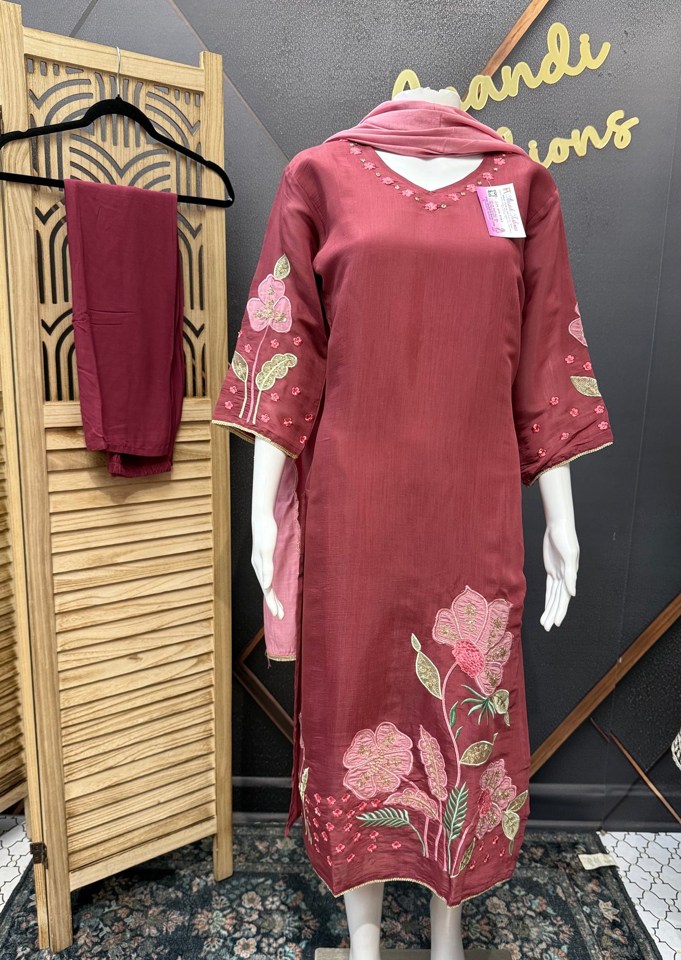Muslin Material- Onion Pink Kurti set with Appliqué Work.