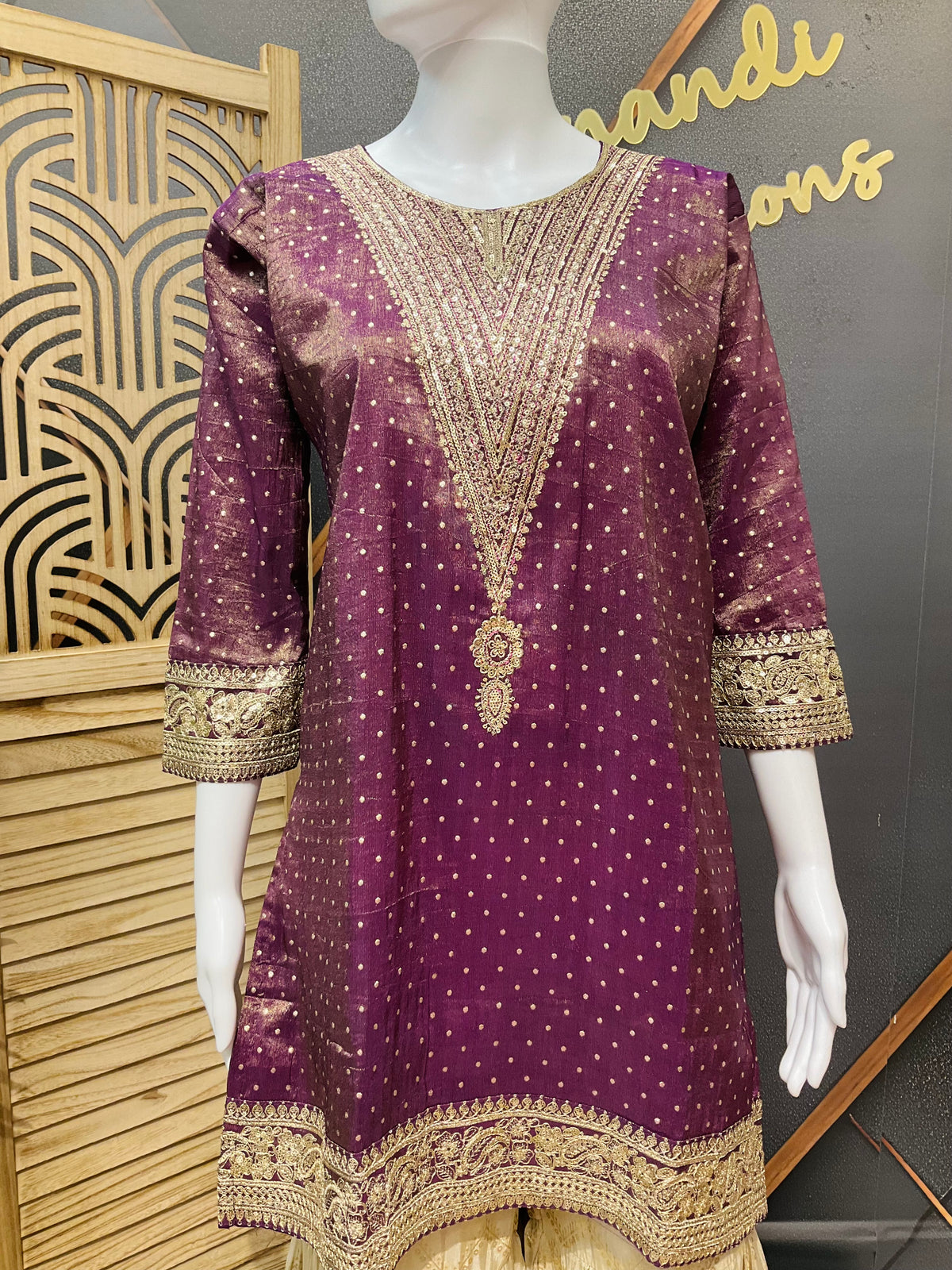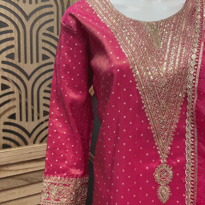 Shimmery Tissue sharara set with Polka dots on Top and comes with contrast half white color sharara set and Organza Dupatta