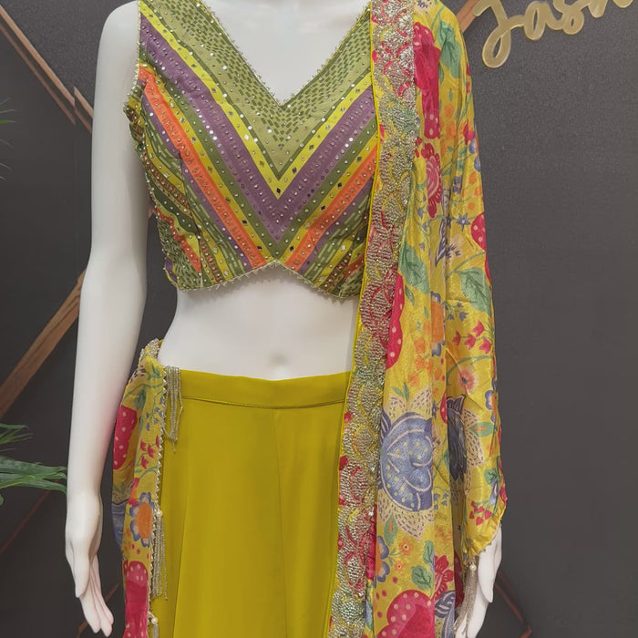 Indo Western Style - Yellow Chiffon Sharara set with Floral Print Dupatta.