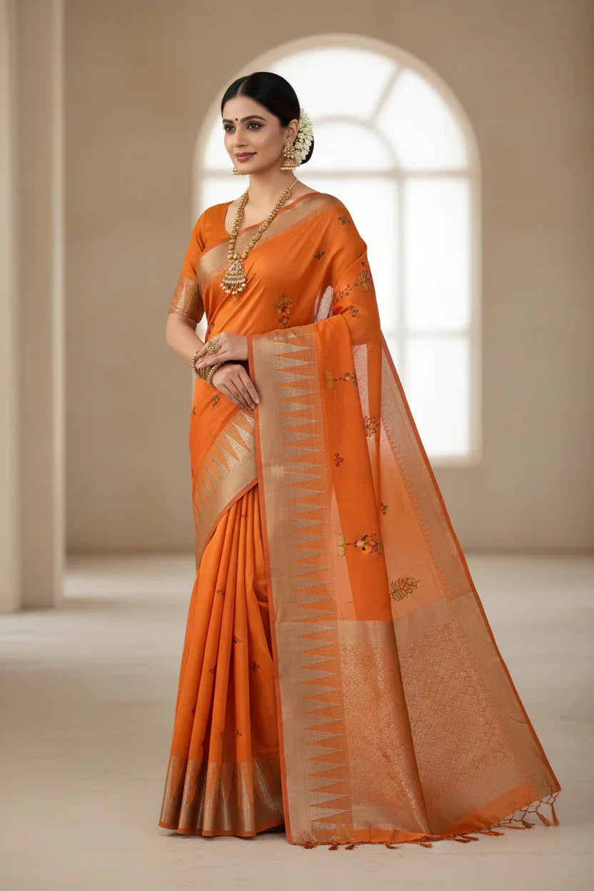 This saree showcases a beautiful vibrant orange color that symbolizes energy, enthusiasm, and auspiciousness in Indian culture. The intricate temple border adds traditional elegance and cultural depth, creating a perfect balance between festive vibrancy and timeless sophistication. This saree drapes beautifully and photographs wonderfully, making it ideal for special occasions.