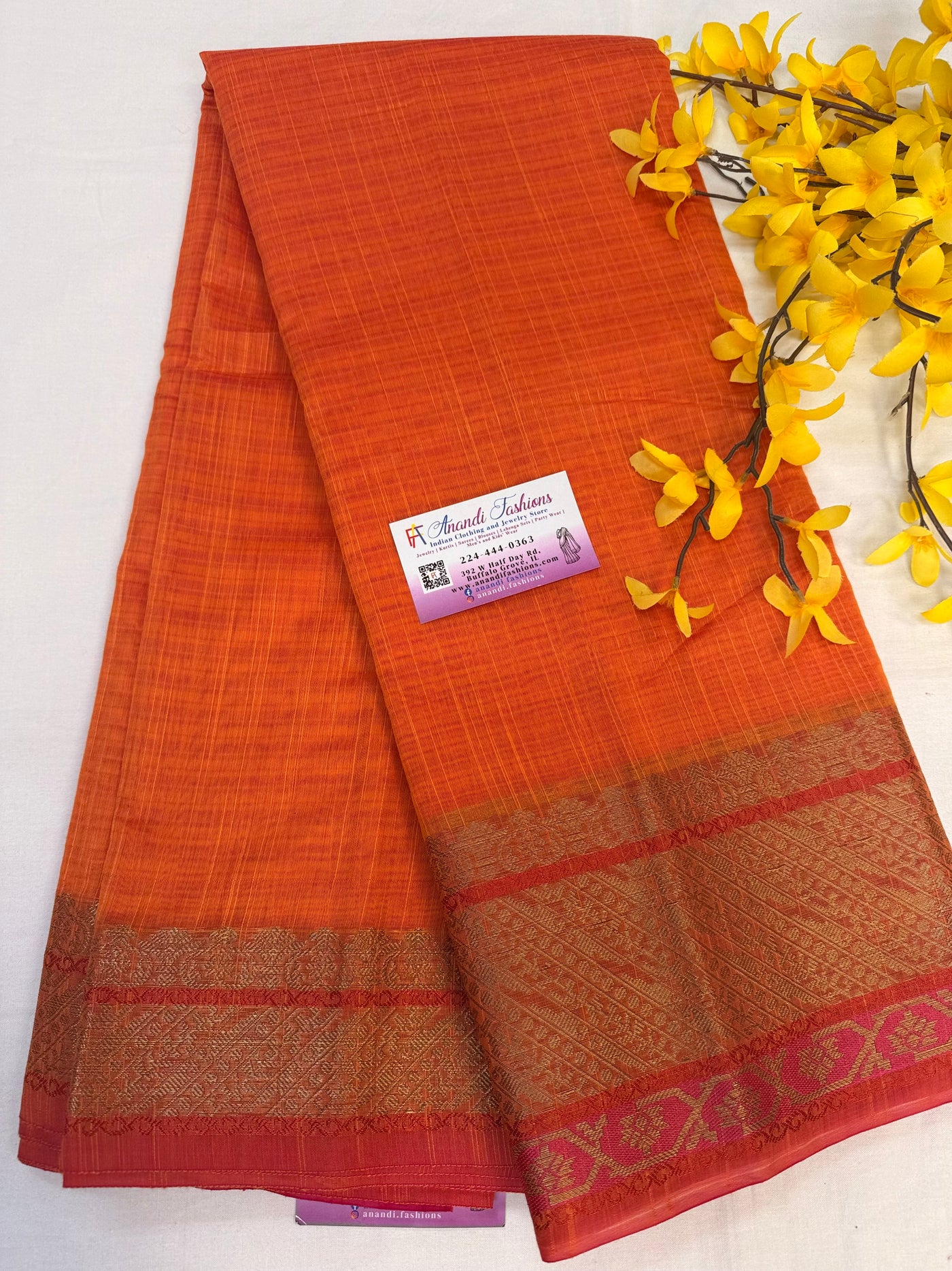 Fancy Jute Saree with 6 inch Border. Orange saree comes with Contrast pink color Blouse material.