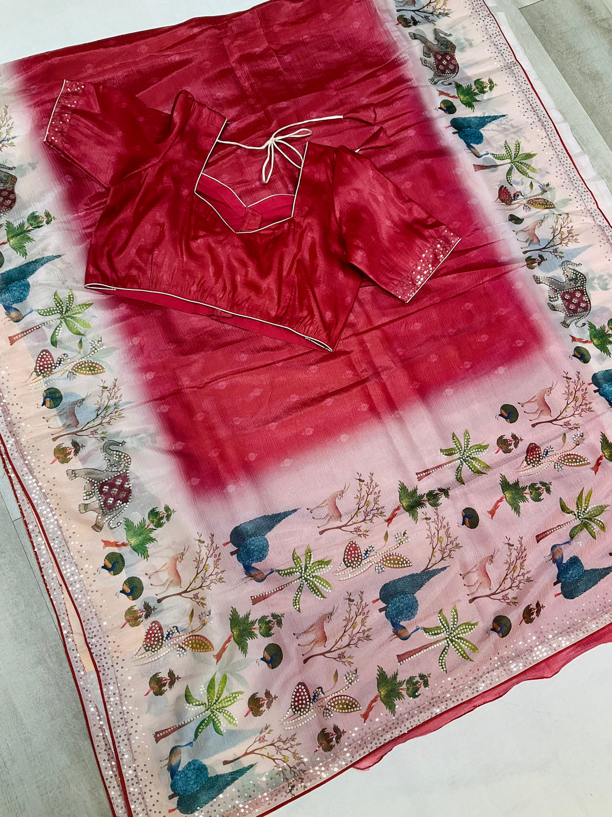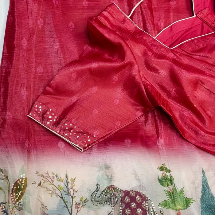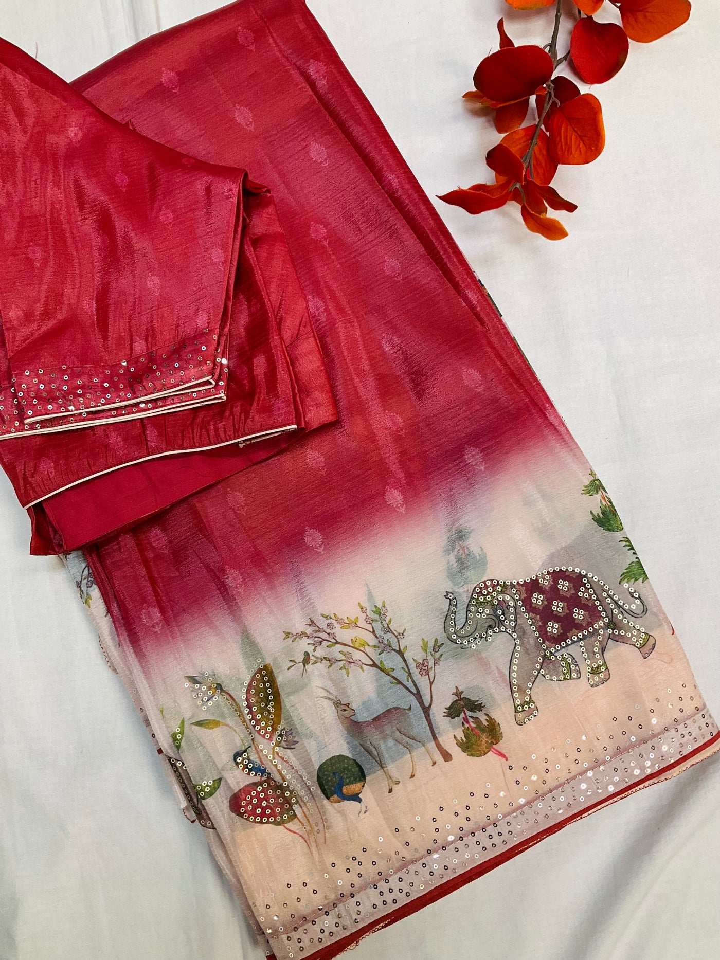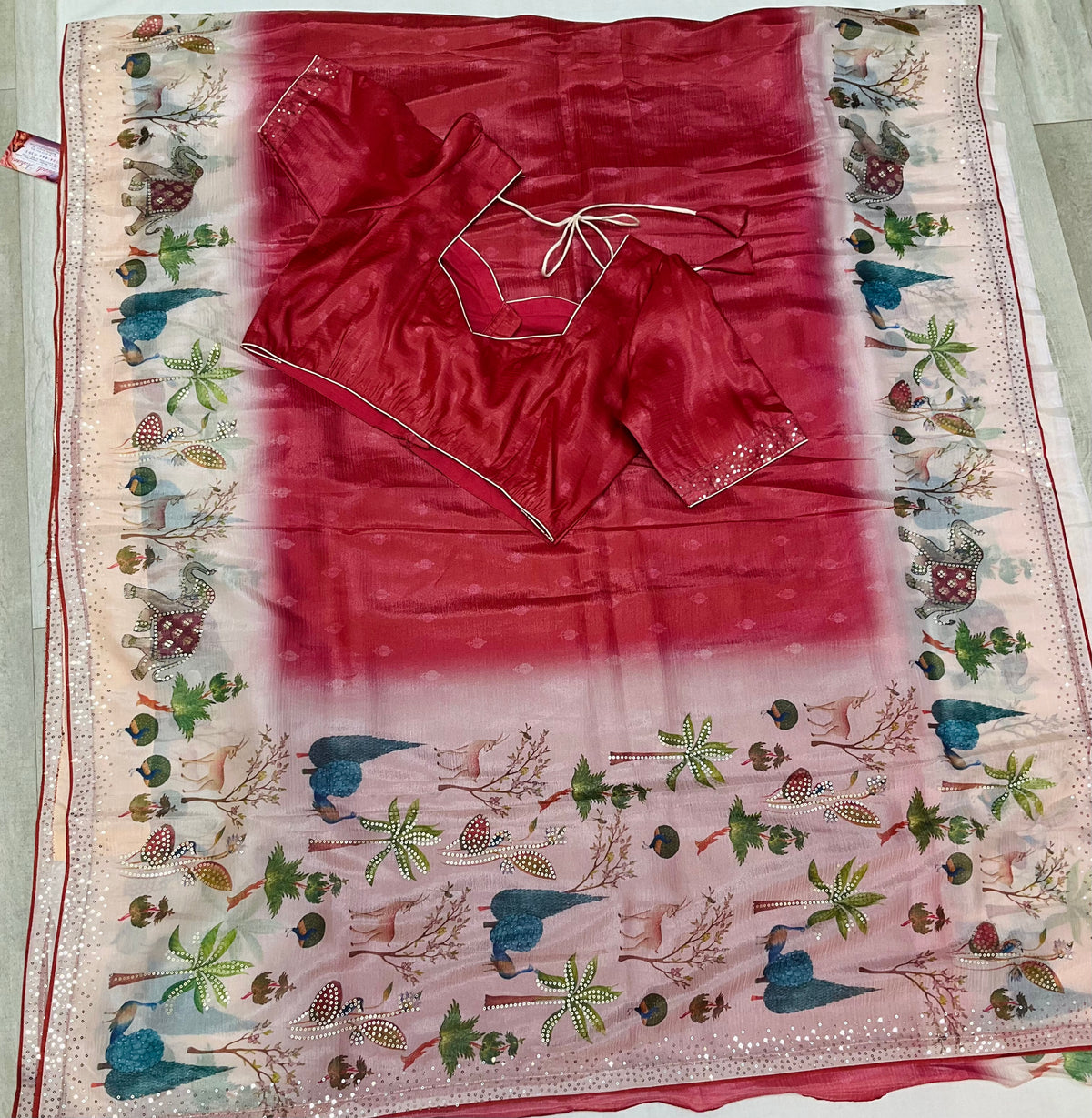 Inform when this item available Red Party wear saree with Stitched blouse - fall pico done