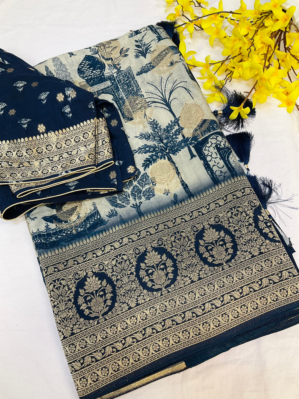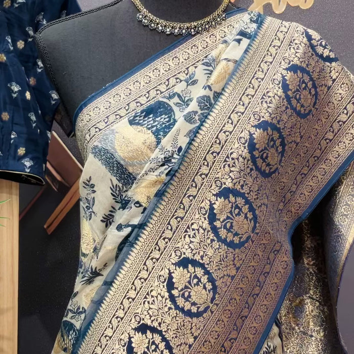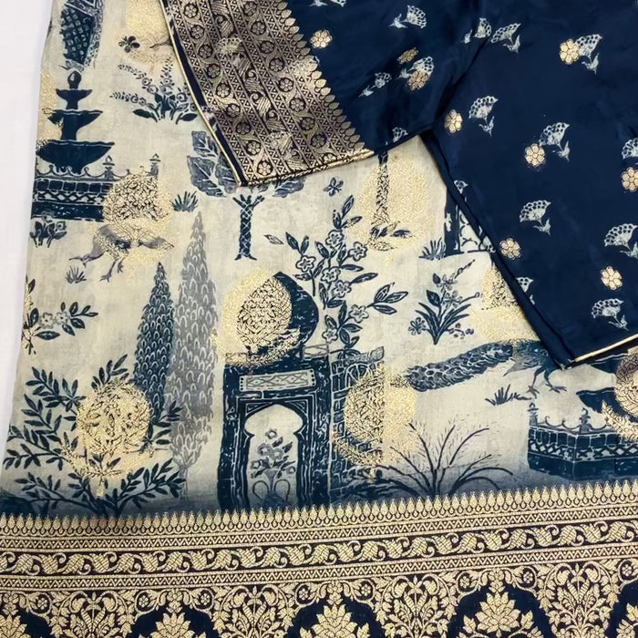 Designer Russian Silk Saree with Stitched Blouse and fall pico done. A very Unique Design Saree