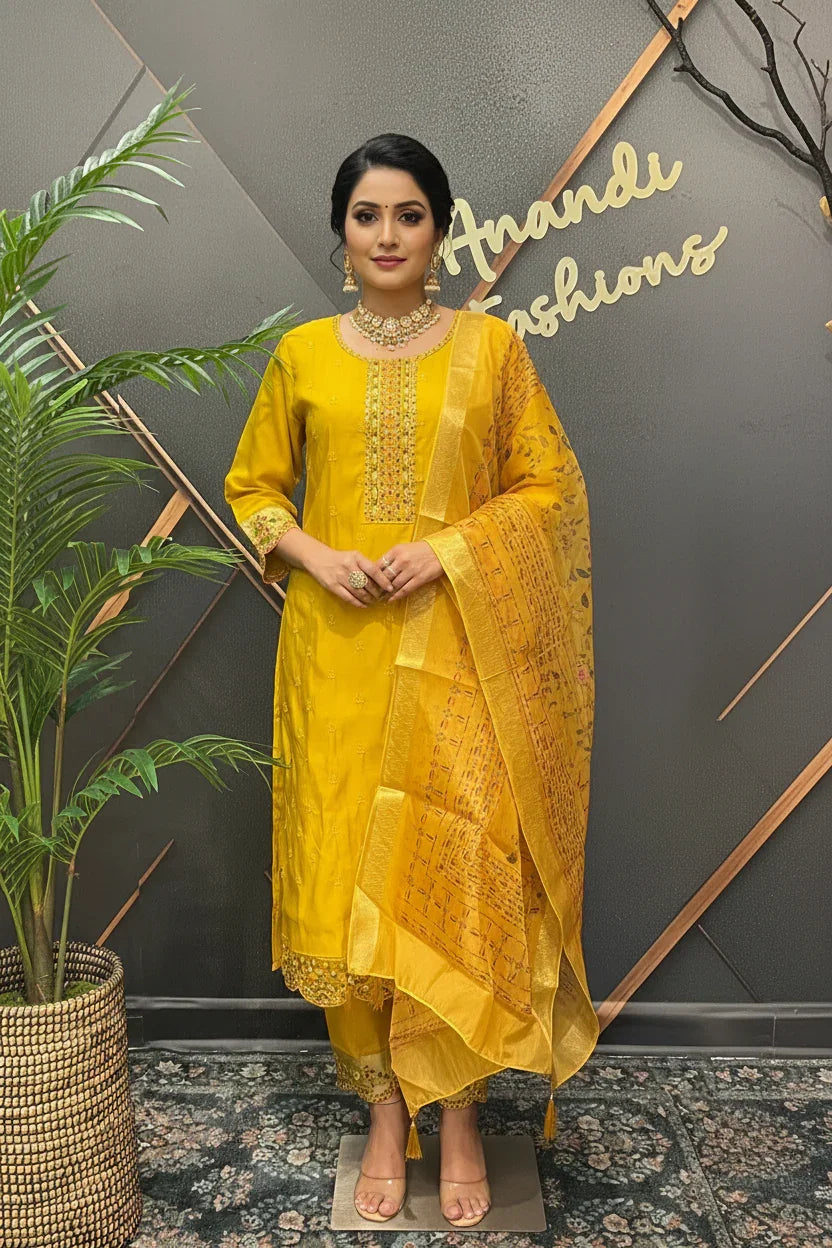 Roman silk mustard yellow kurti set with digital print dupatta. Elegant and stylish for special occasions.