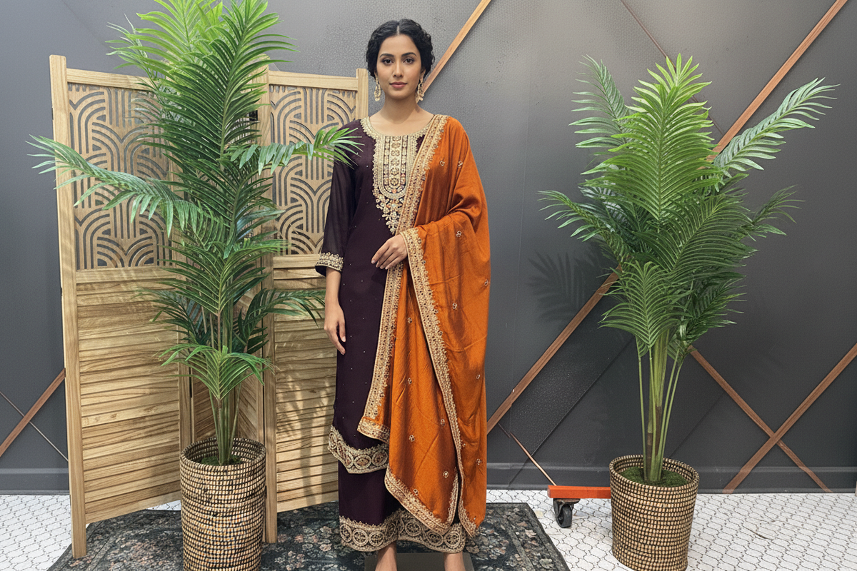 Beautiful Party Wear Chudidhar/Kurti set with contrast work Dupatta and Palazzo Pants.