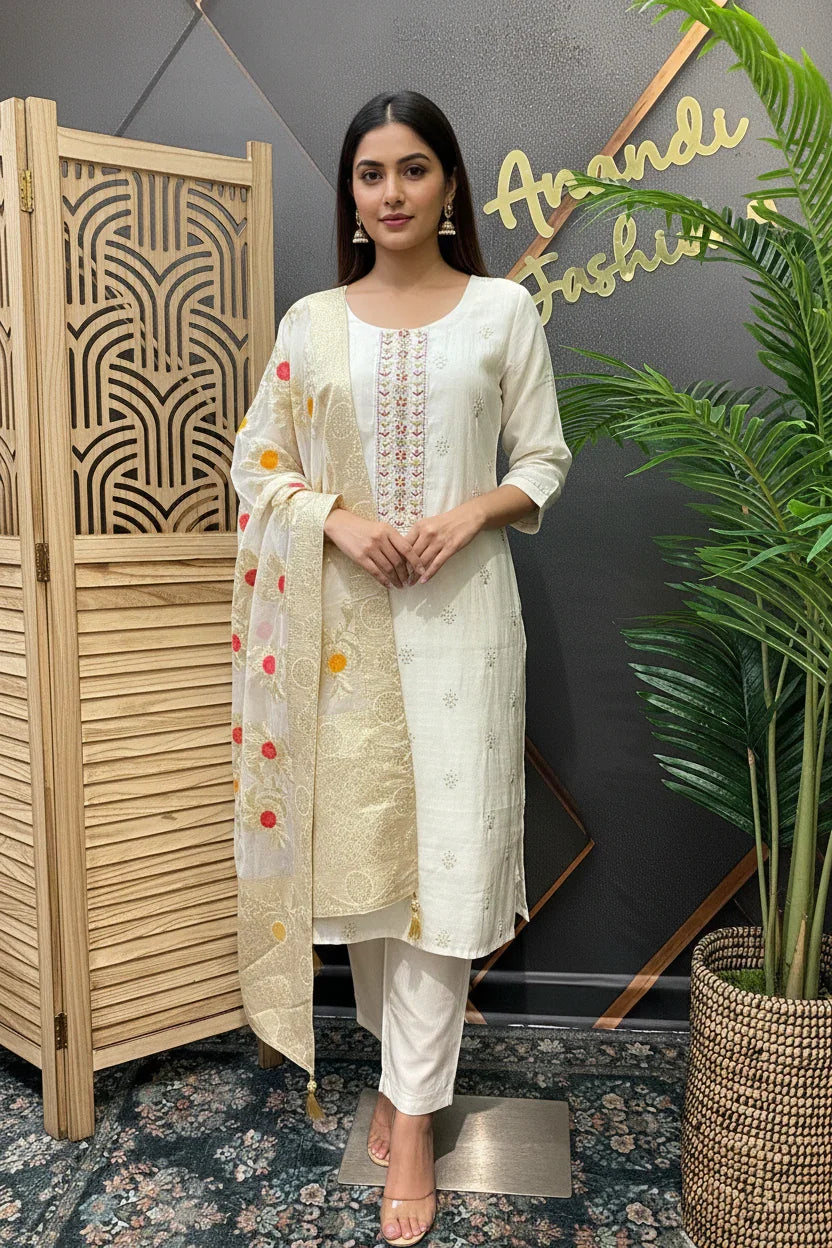 Party wear white kurti set with Benarasi dupatta, size 44. Elegant and traditional for special occasions.