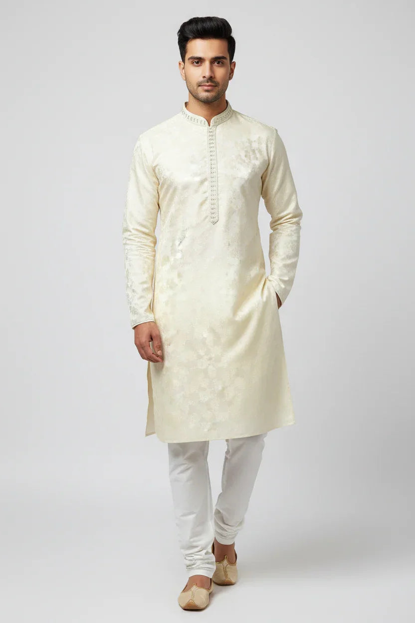 Cream/Half White Mens wear Kurta set with floral Self design. Rich material- soft touch.