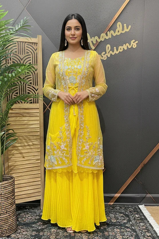 Perfect for parties and celebrations, this saree combines traditional elegance with contemporary styling. The vibrant yellow georgette drapes beautifully and creates a graceful silhouette, while the coordinating overcoat adds a modern, sophisticated layer that makes this ensemble truly unique. The premium quality georgette fabric flows elegantly and photographs wonderfully, ensuring you stand out at every celebration.