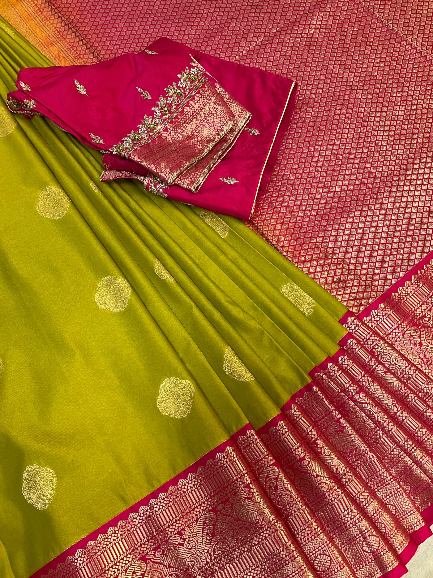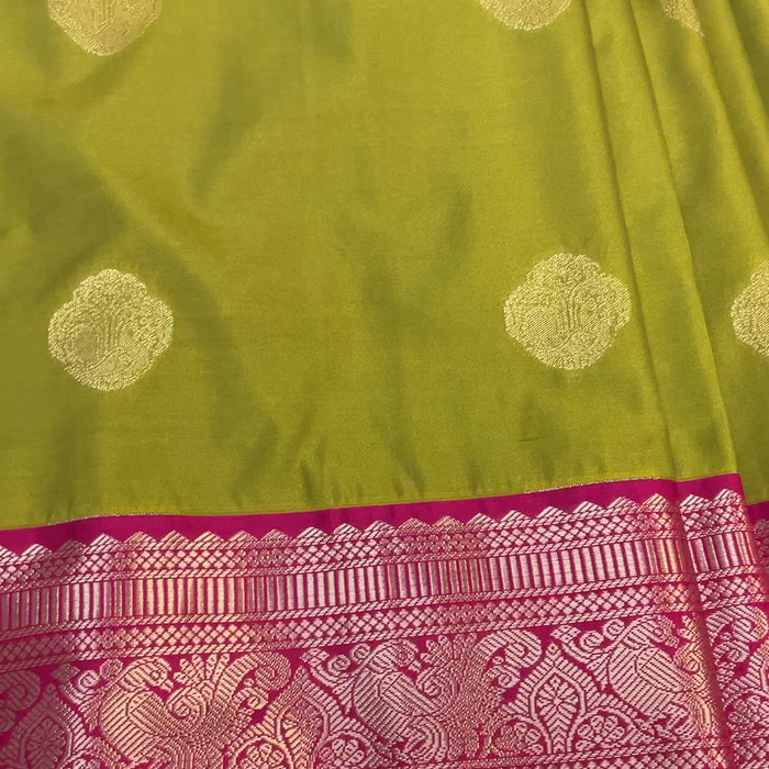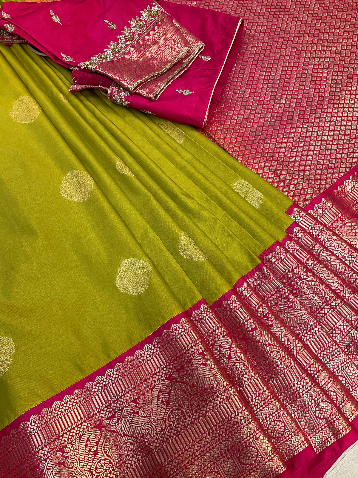 Inform when this item available Mehandi green semi kanjeevaram Pattu/Silk saree with maggam work Stitched blouse- Fall Pico done