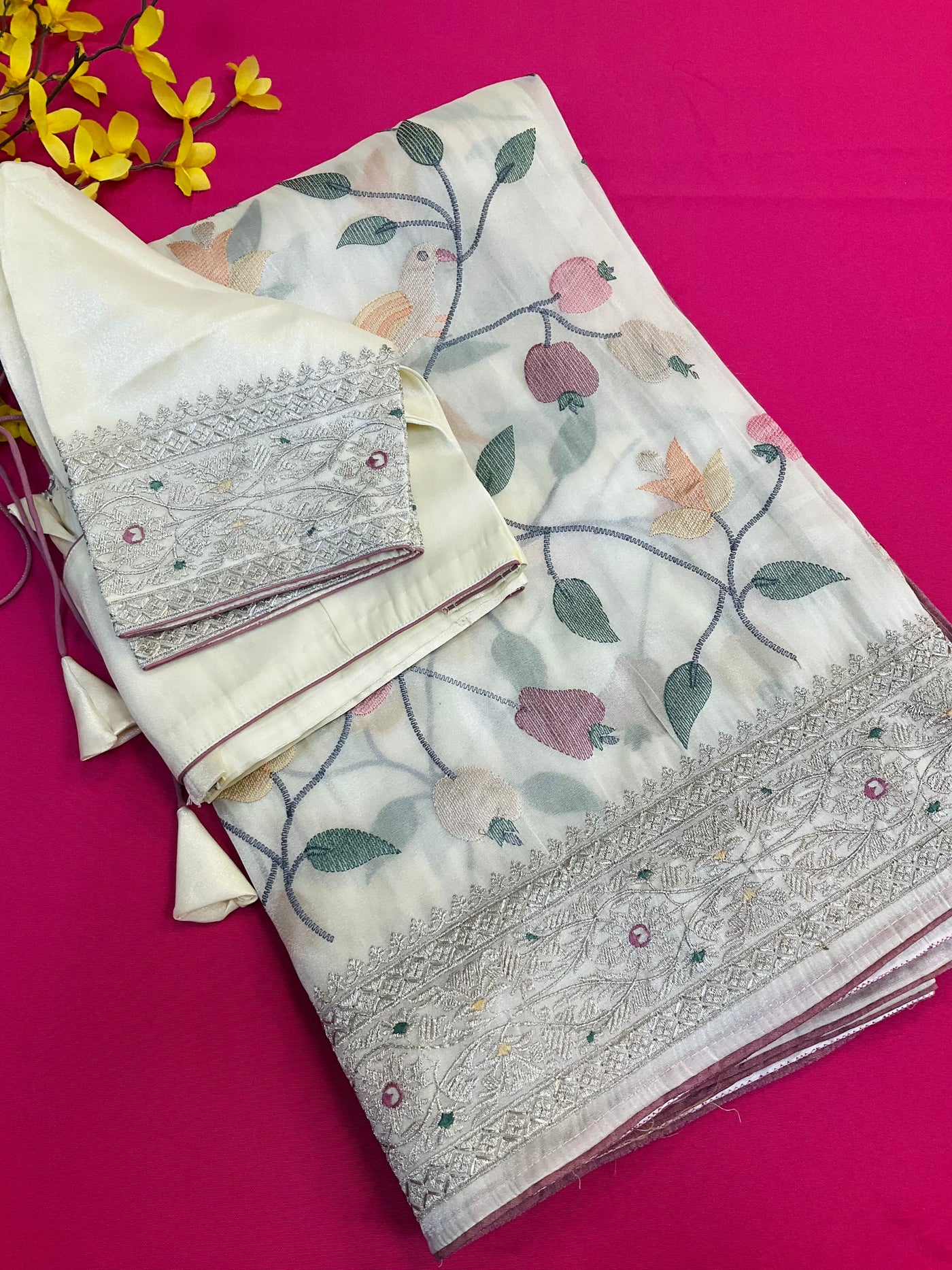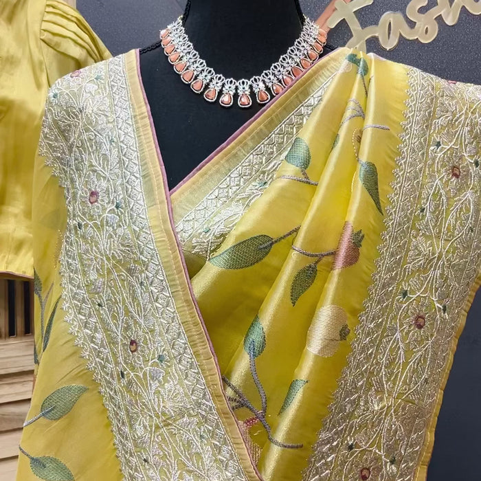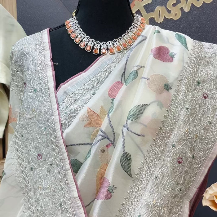 Inform when this item available Oragnza Tissue Embroidery work saree with Stitched blouse