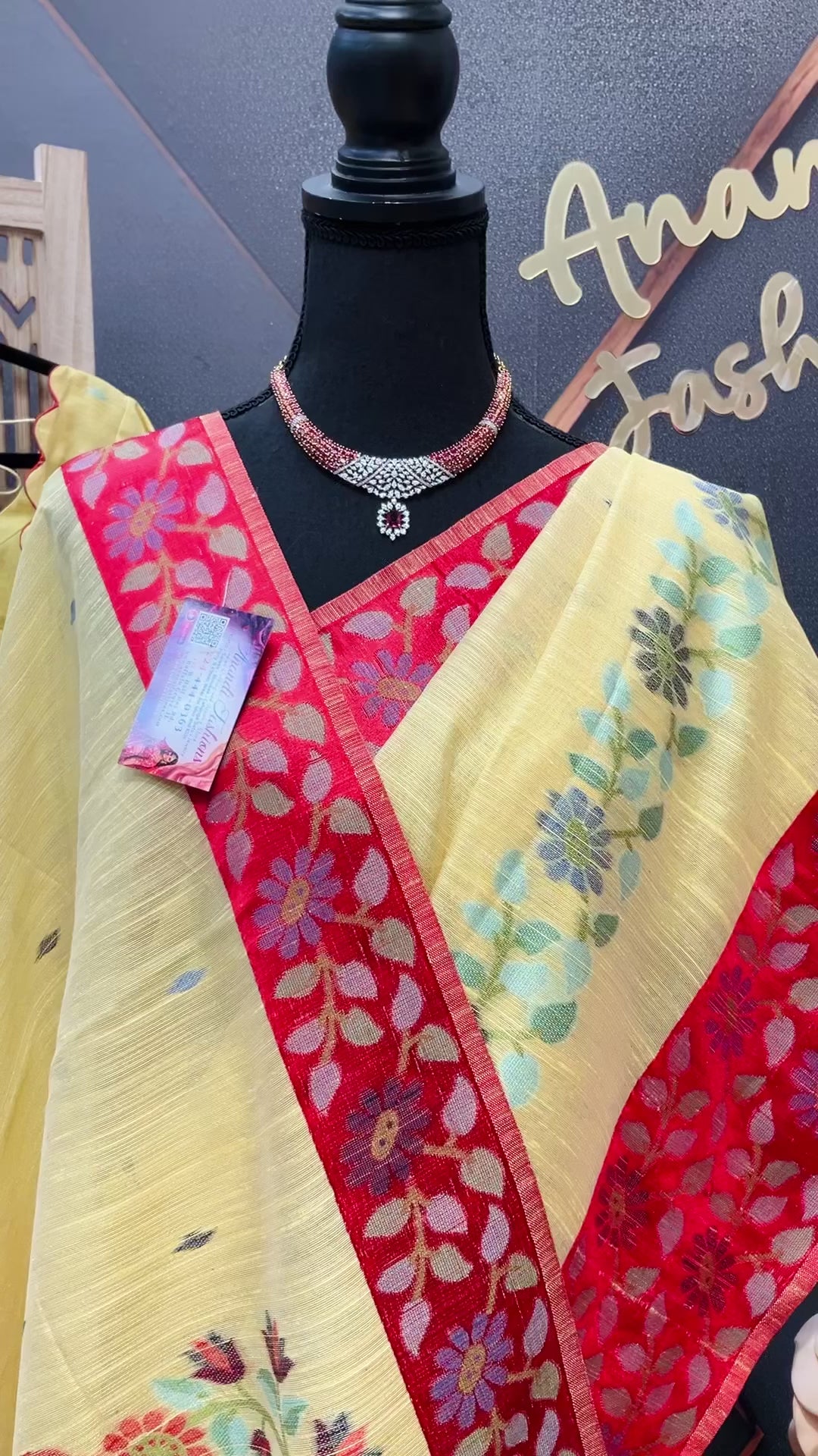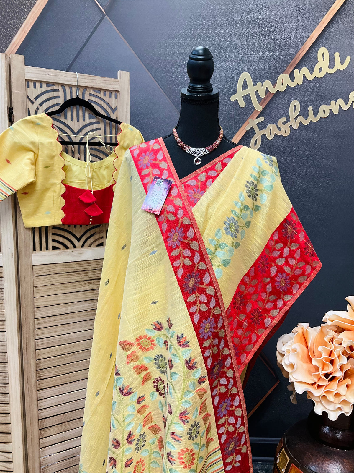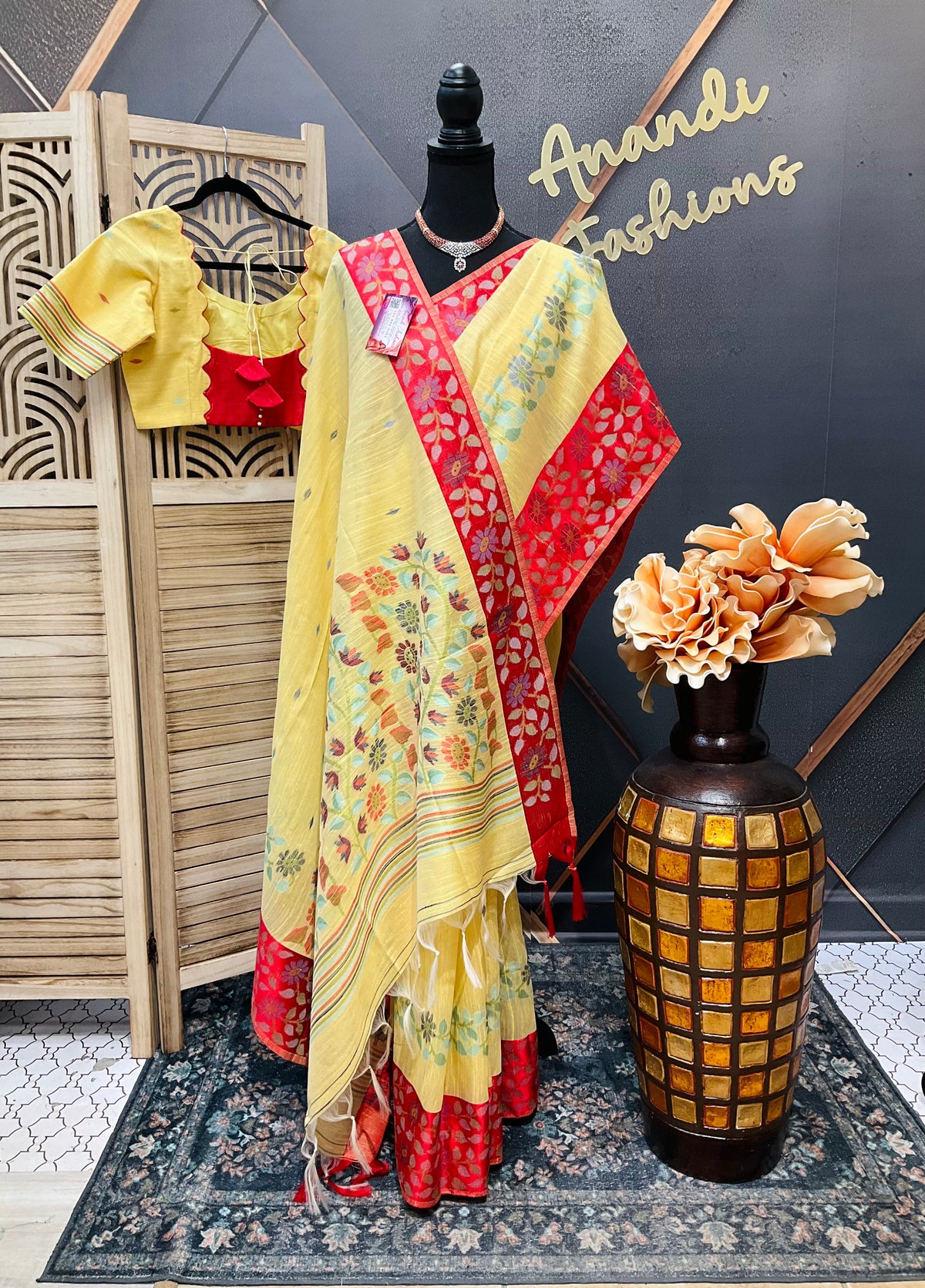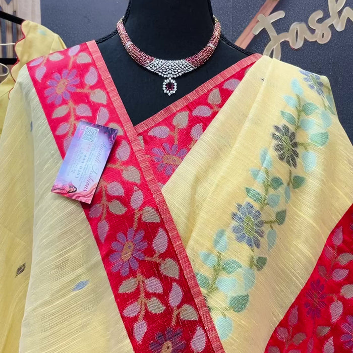 Yellow-Lenin Jamdhani saree with Stitched blouse-fall pico done