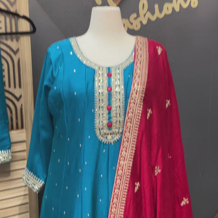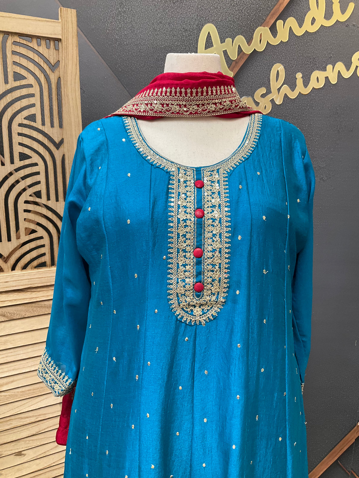 Party Wear Blue Anarkali Kurti set with Contrast Dupatta.