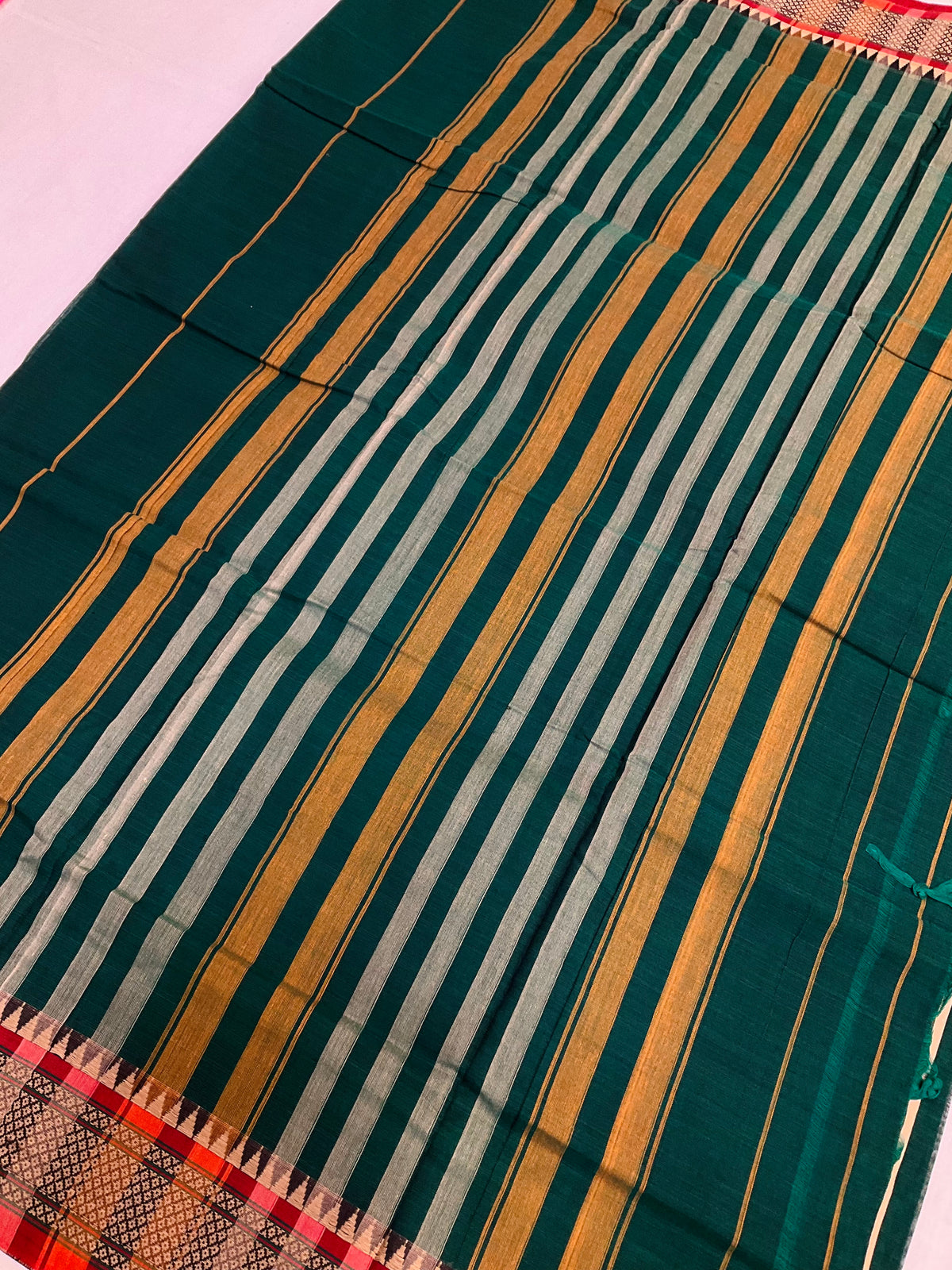 Narayanpet Green - Pure Cotton Saree with Maroon Border and Temple Design.