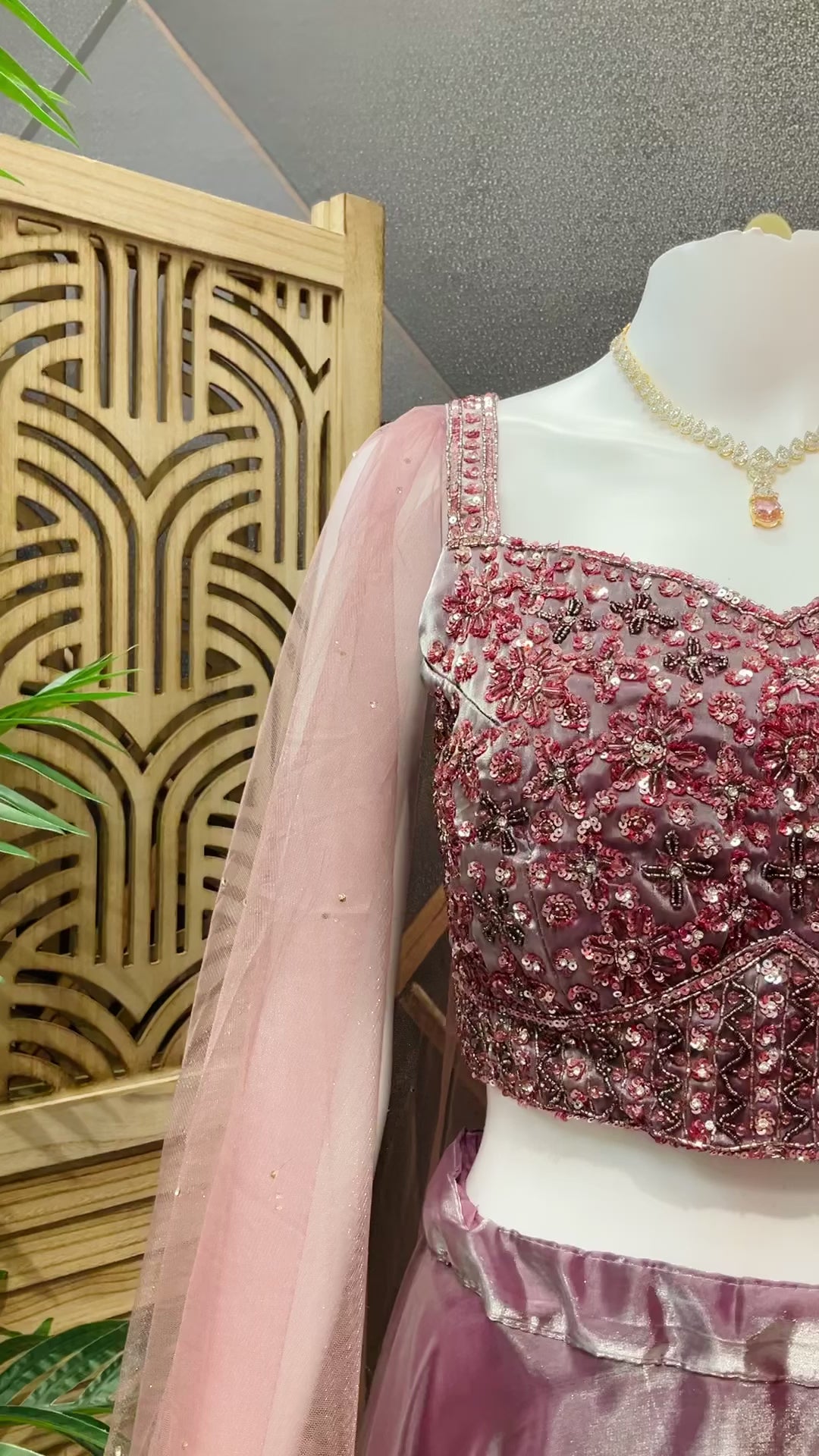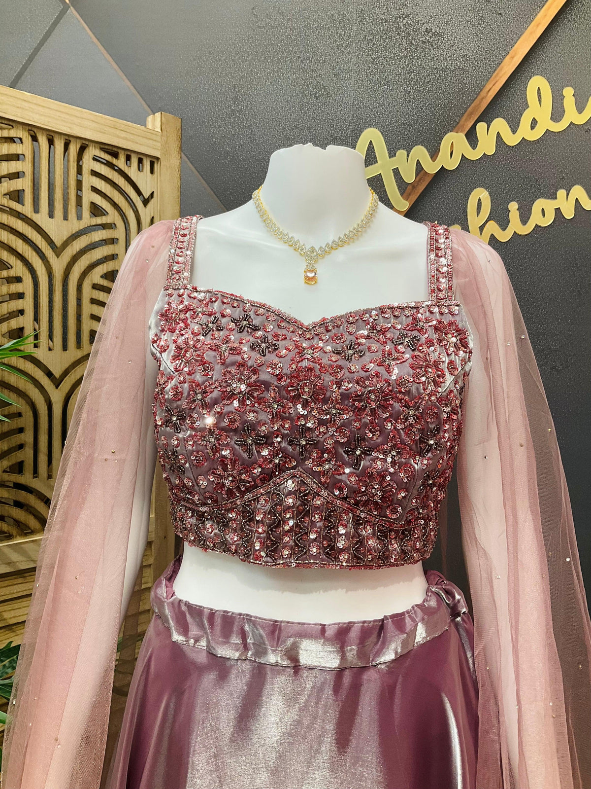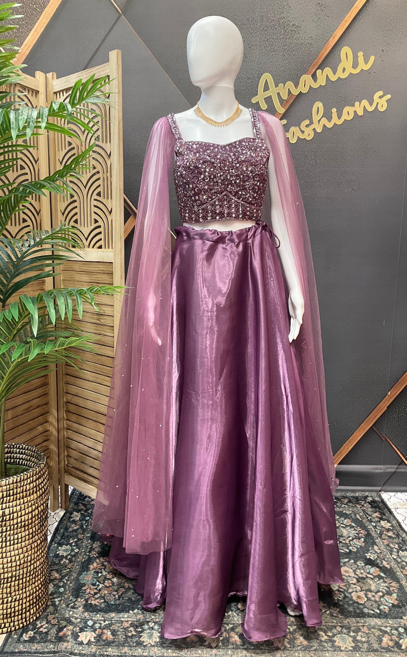 Fancy Satin Silk Lehenga Choli Set - Long Sleeves Party Wear - Size 40 / Light violet
