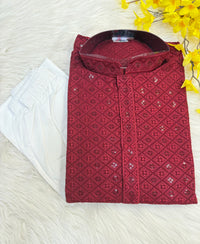 Maroon Color Sequence Men’s Wear Rayon Kurta with white color elastic pants.