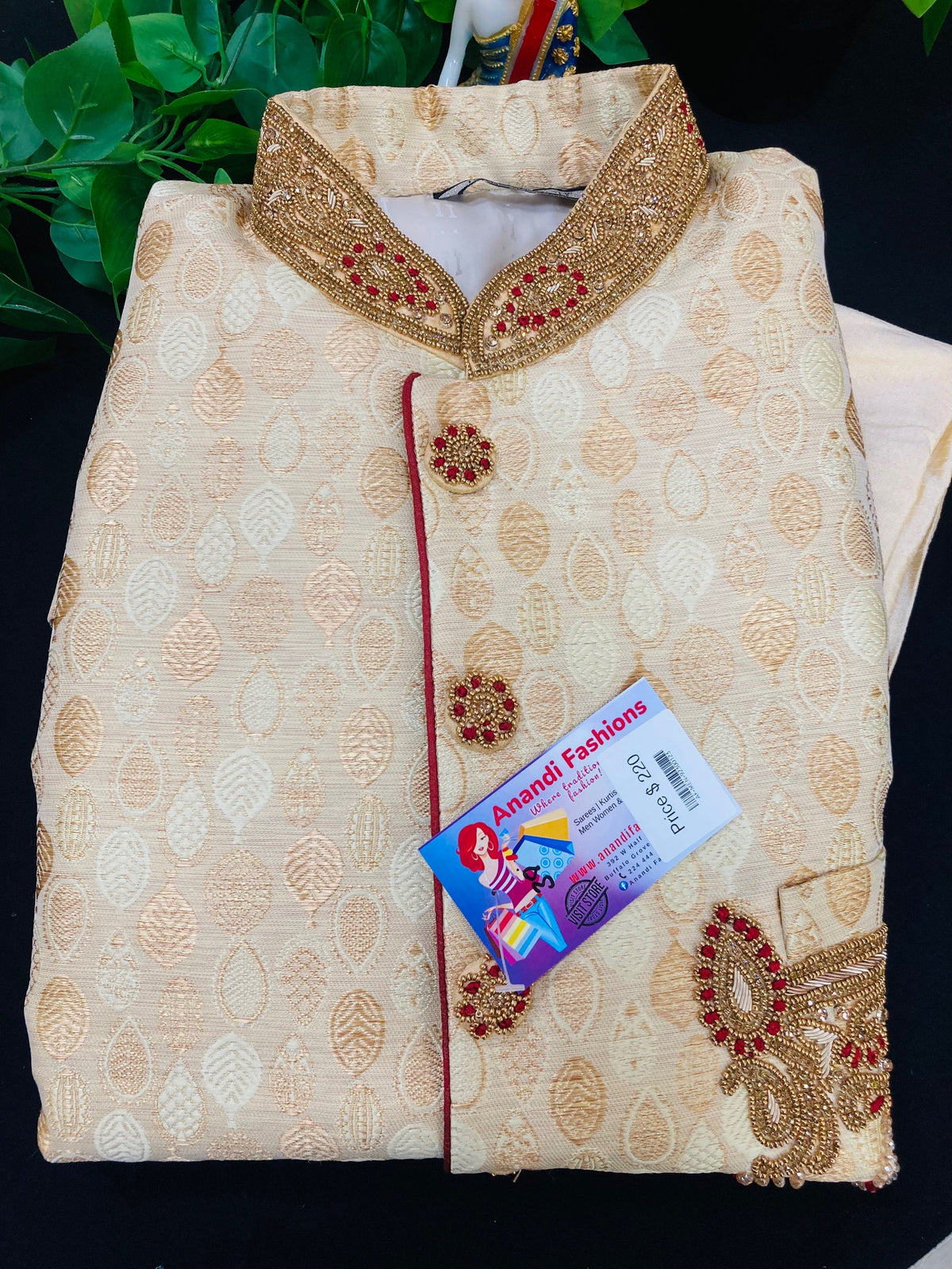 This stunning Gold Mens Sherwani with Jodhpuri pant is the perfect addition to any formal occasion. Made with high-quality materials, the sherwani features intricate embroidery and a flattering fit. The Jodhpuri pant adds a traditional touch and completes the look. Whether attending a wedding or special event, this sherwani will make a statement and leave a lasting impression. Don't miss out on adding this must-have piece to your wardrobe.
