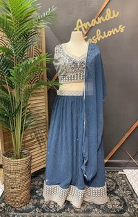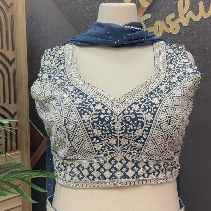 Blue Color - Georgette Lehenga set with white thread work on Both sides of the Lehenga.
