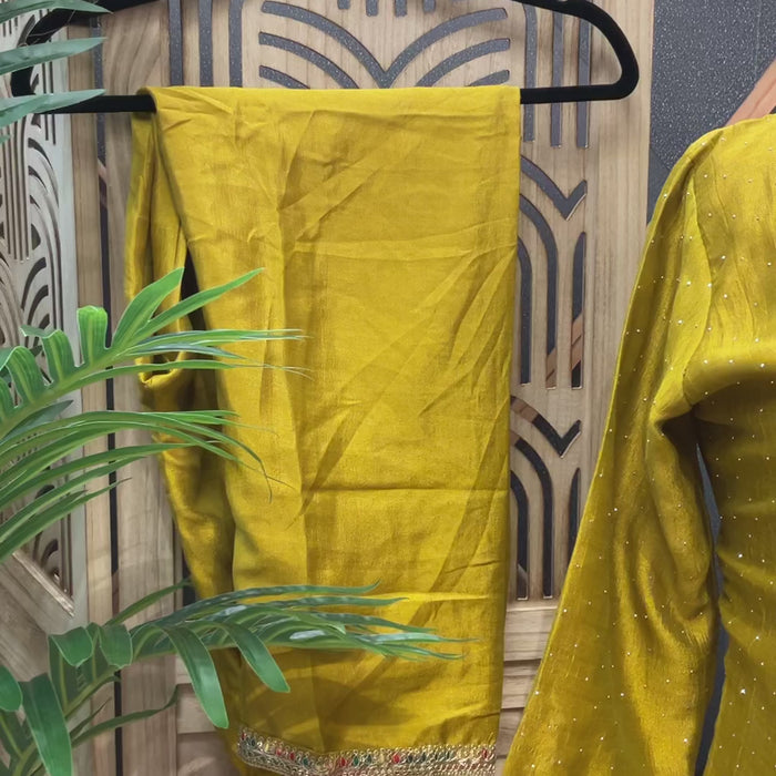 Vichitra Silk - Mustard Yellow color Anarkali Kurti set with Digital Print Dupatta - available in plus sizes.