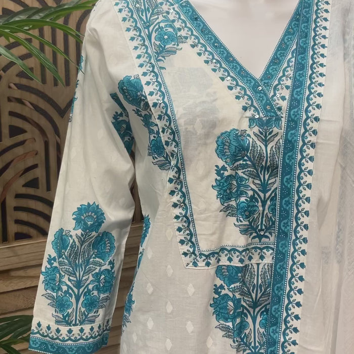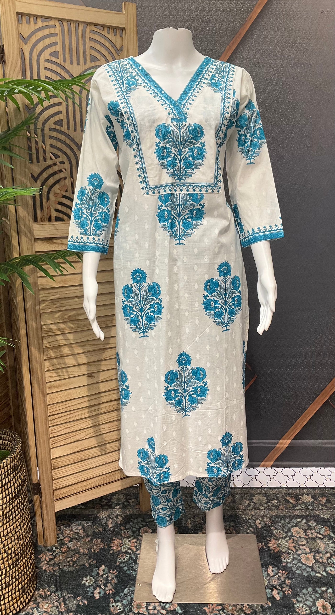 Inform when this item available Size 42- White Pure Cotton Kurti set with Blue print