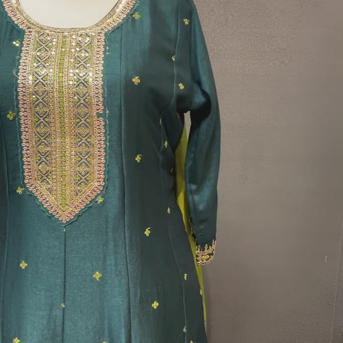 Plus Size Bottle Green Anarkali Kurti set with Neon Green Color Dupatta.