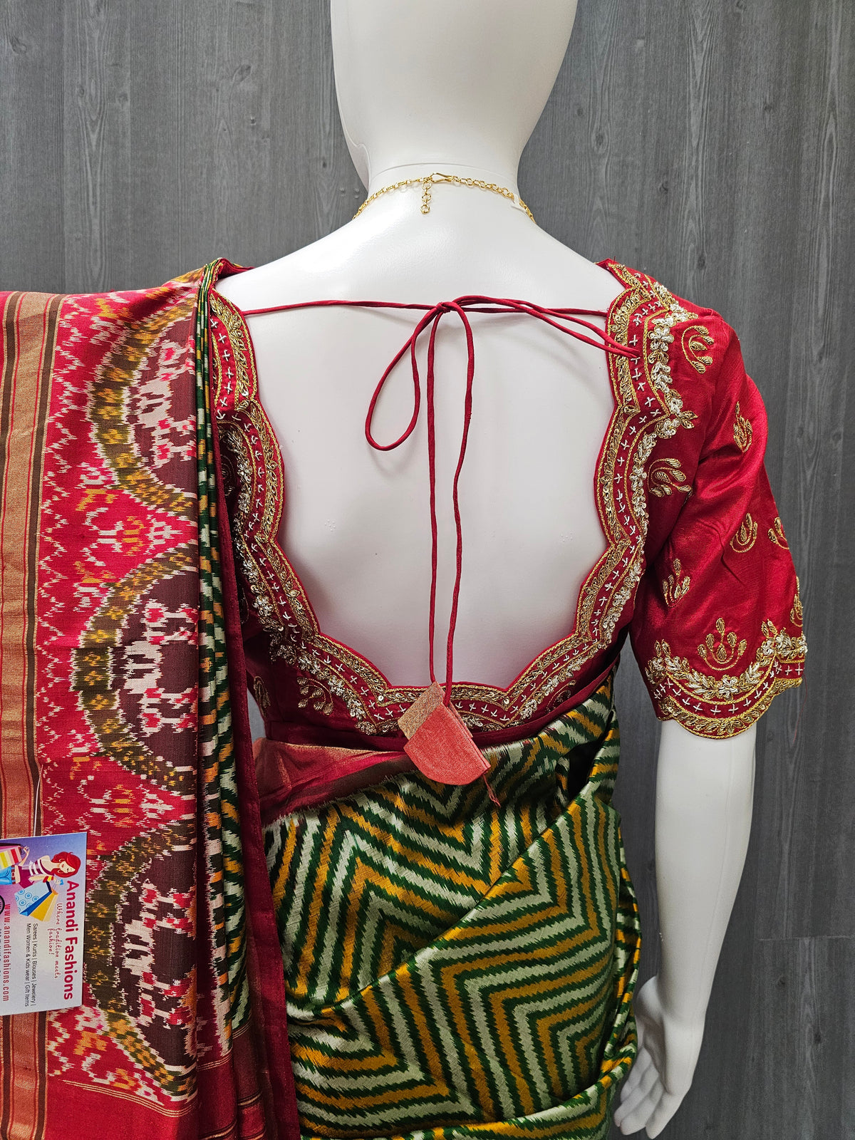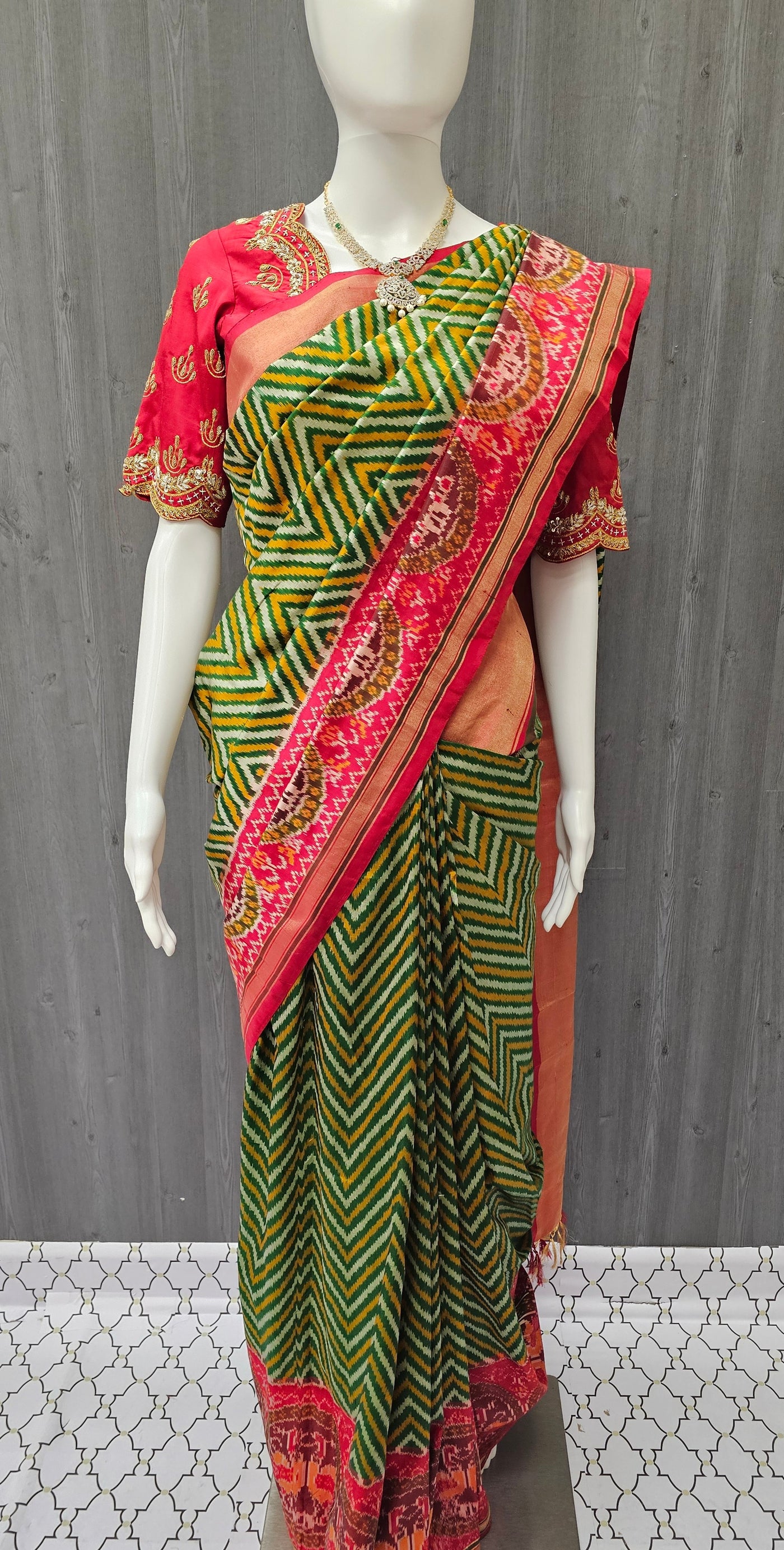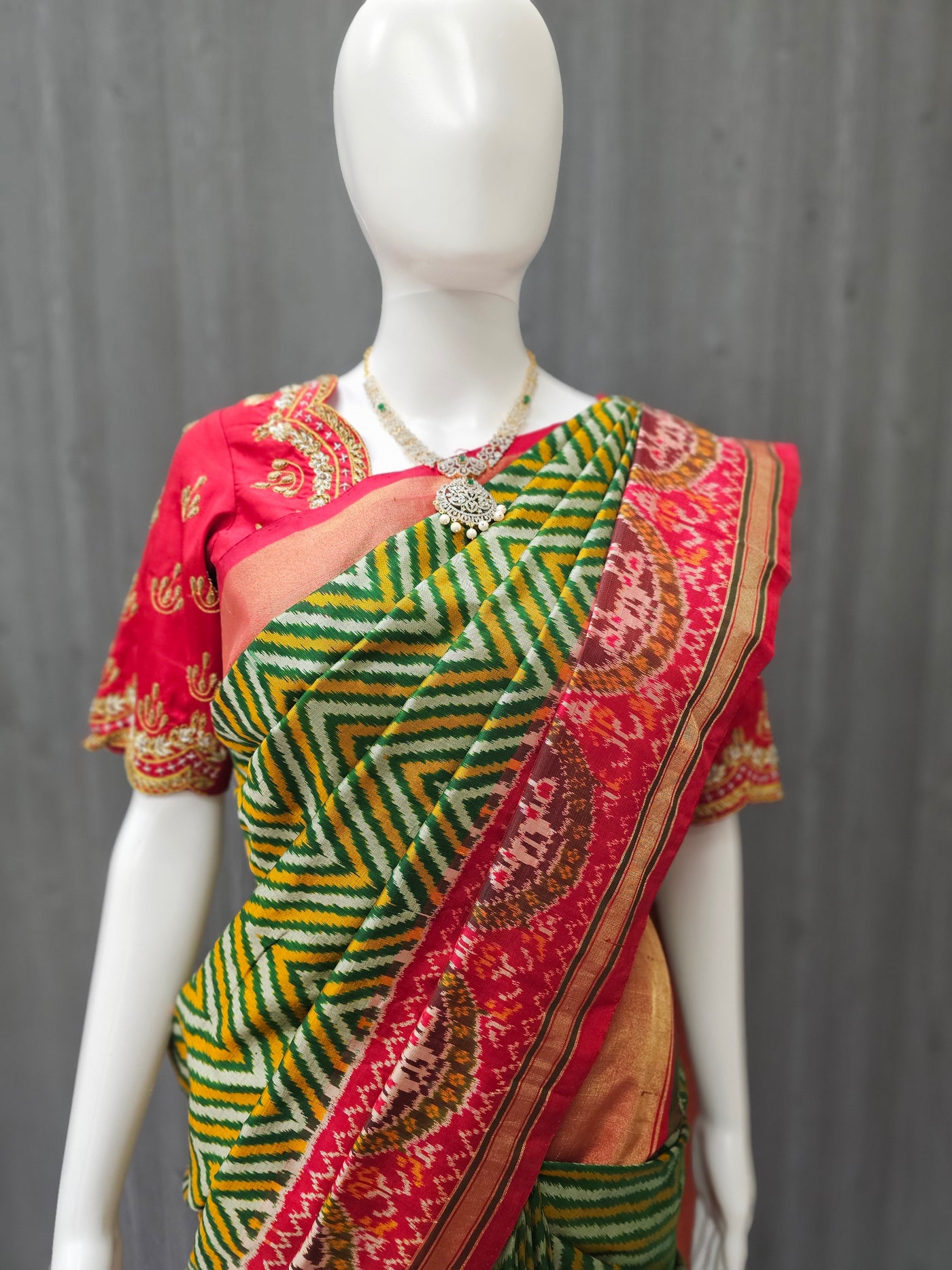 Elevate your ethnic wardrobe with this stunning South Indian Silk Saree in red and green combination. Crafted from pure silk and certified handloom, this Ikkat Saree features a very unique and intricate design, making it a high-quality and luxurious addition to your collection. The Ikkat Saree is a type of saree that showcases the elaborate tie & dye technique, where the silk threads are dyed with colors before weaving, resulting in stunning patterns that exude elegance and grace. The red and green combination is a classic and festive choice, symbolizing prosperity, joy, and harmony.