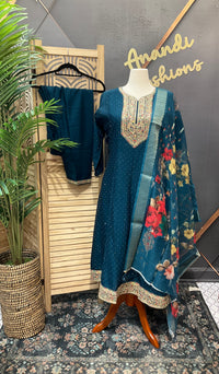 Vichitra Silk - Teal Blue color Anarkali Kurti set with Digital Print Dupatta - available in plus sizes.