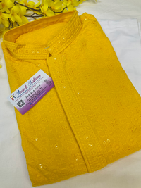 Yellow chikankari sequence kurta with white pants.